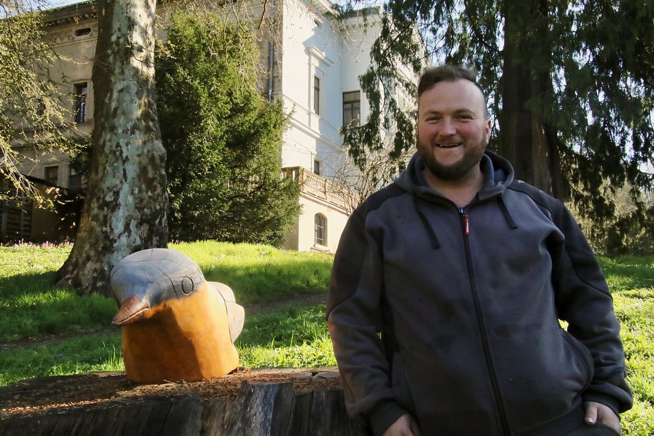 Zwei Neuzugänge für den Park: den schmucken, kleinen Kleiber auf der Stumpf der alten Rosskastanie hat der neue Anleiter für die Parkpflege, André Schmilowsky, selbst aus dem Holz einer in Hohenrode gefällten Esche und etwas Eiche für die kleinen Spaziergänger im Park zurecht gezimmert (Foto: Förderverein Park Hohenrode)