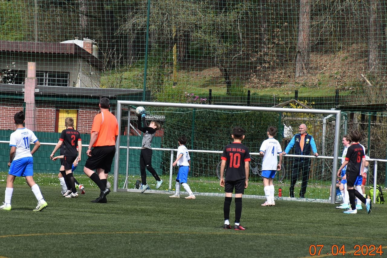 Im Gegenangriff war auch Jakob Winter im Wacker-Tor auf dem Posten und hielt den Salza-Schuss. In der 24. Minute legte Liu Hillenhagen einen Freistoß aus dem rechten Mittelfeld auf den zentral sich anbietenden Gustav Böer, der das Leder aber über das Salzaer Tor schoss. Durch einen sehenswerten Alleingang von der Mittellinie ließ Henri König die Gegenspieler stehen und vollendete ins rechte untere Toreck zur 2:0 Pausenführung.