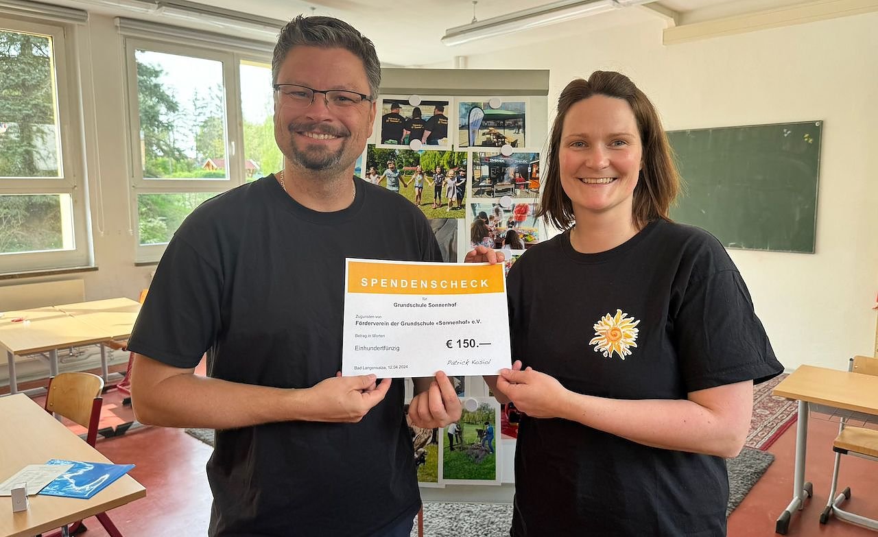 Patrick Kosiol, langjähriges Mitglied und Förderer unseres Fördervereins, engagierter Papa und ein aussichtsreicher Kandidat für die Wahl des neuen Bürgermeisters unserer Stadt, nutzte die Gelegenheit und spendete dem Förderverein 150 Euro. Geld, dass der Förderverein sehr gut gebrauchen kann, sagte Evelyn Schreiber ( stellvertretende Vorsitzende), denn am 17.August findet wieder das traditionelle Sommerfest der Sonnenhofschule statt.
