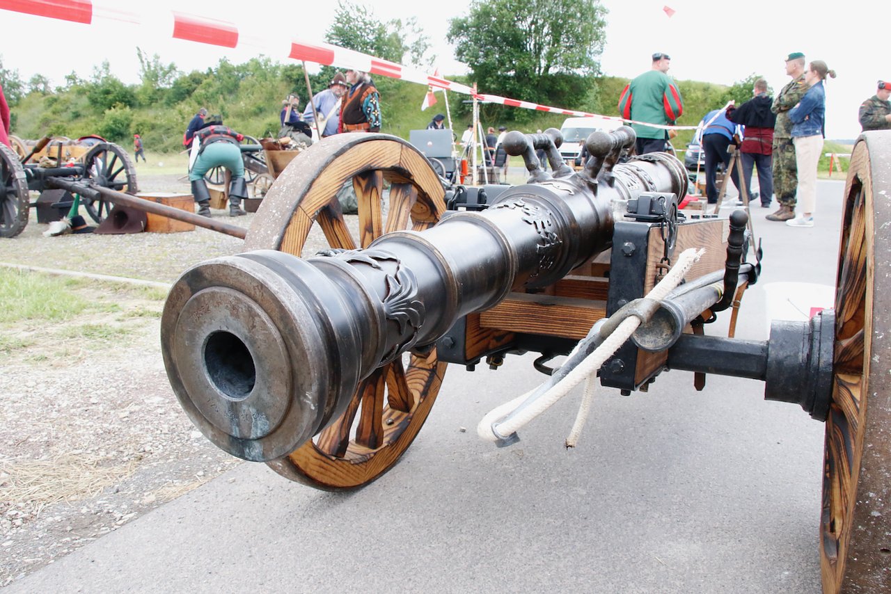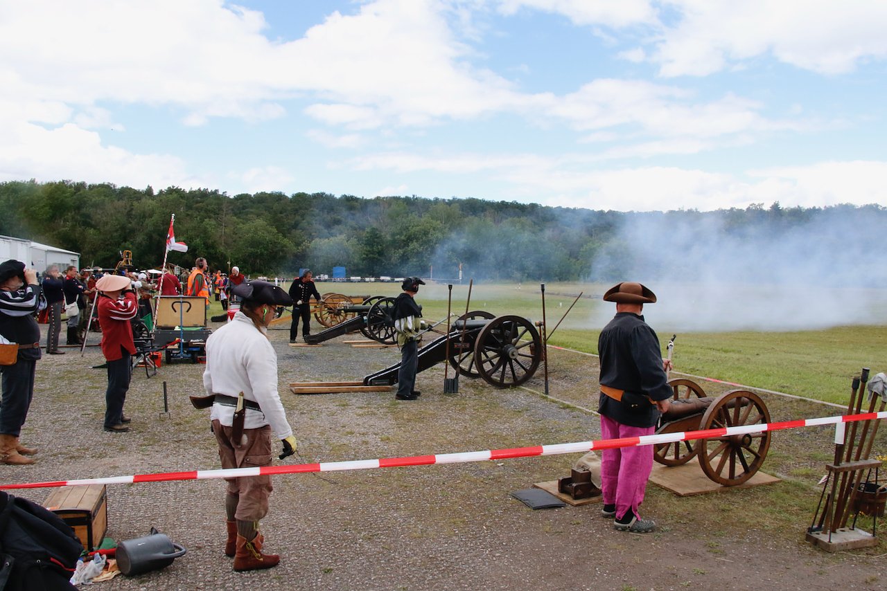 Mit dabei war auch Albrecht Uhlmann und sein Nordhäuser "Lindwurm", ein Nachbau des alten Stadtgeschützes, das die Altvorderen zu den "Sieben Wundern" Nordhausens zählten. Uhlmann stellt die Visierung heute aber nicht selber ein, er lässt schießen. An der alten Kanone stehen Raphael, Verena und Lukas, jeder im Range des Oberstleutnants. Die Artillerieschützen aus Munster müssen sonst Ziele treffen, die bis zu 30 Kilometer entfernt liegen, heute liegt die maximale Entfernung der Zielscheiben nur bei 400 Metern.
