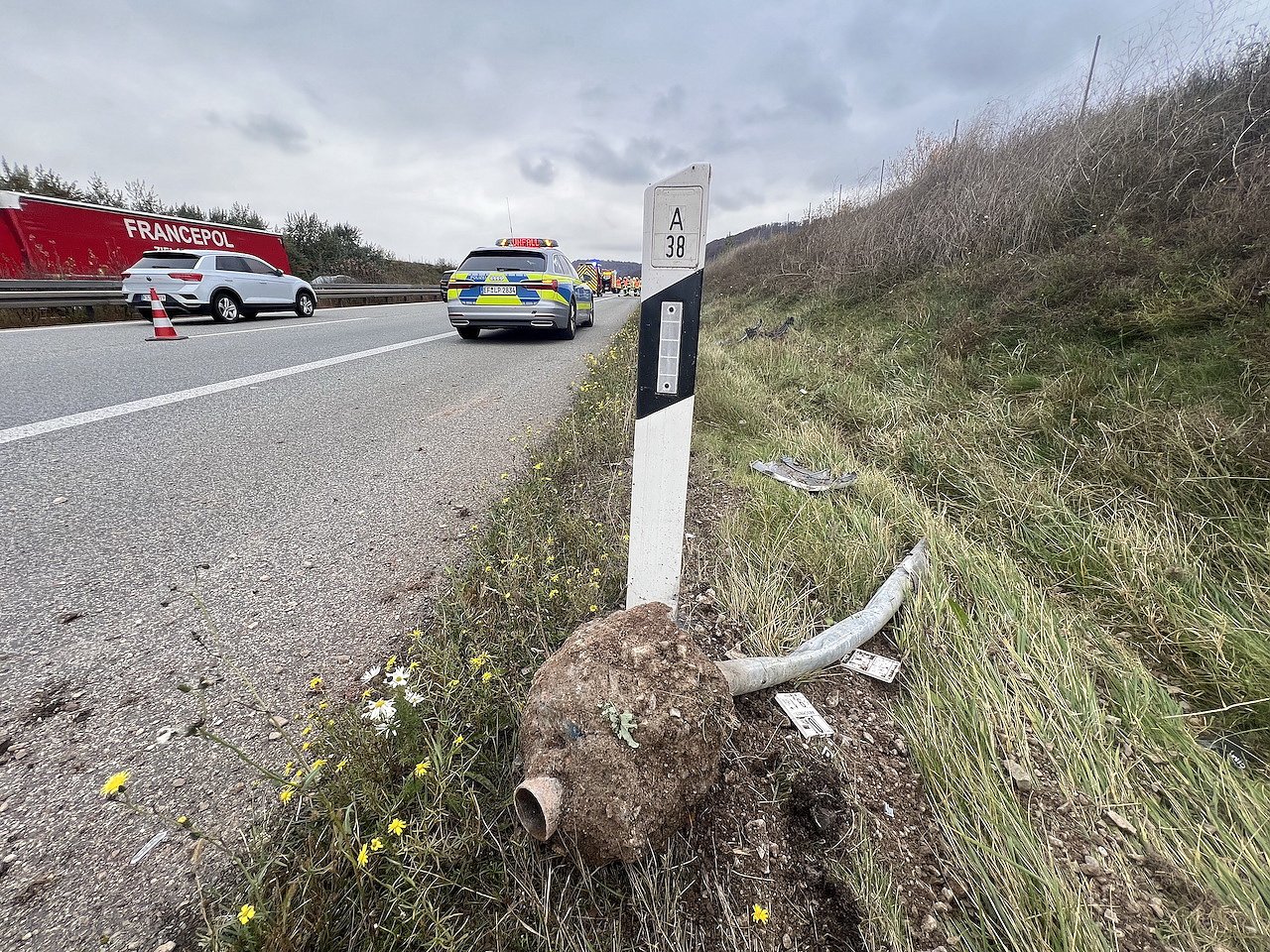 Nach ersten Informationen fuhr ein 20-jähriger Mitsubishi-Fahrer mit seinem Fahrzeug in Fahrtrichtung Göttingen. Aus bisher ungeklärter Ursache kam der Fahrer auf Höhe Kilometer 53,5 auf gerader Fahrbahn nach rechts ab, durchfuhr auf 100 Meter den Straßengraben und prallte gegen eine Schilderpfosten, ehe sich das Auto überschlug und auf dem Dach an einer Notrufsäule zum liegen blieb.