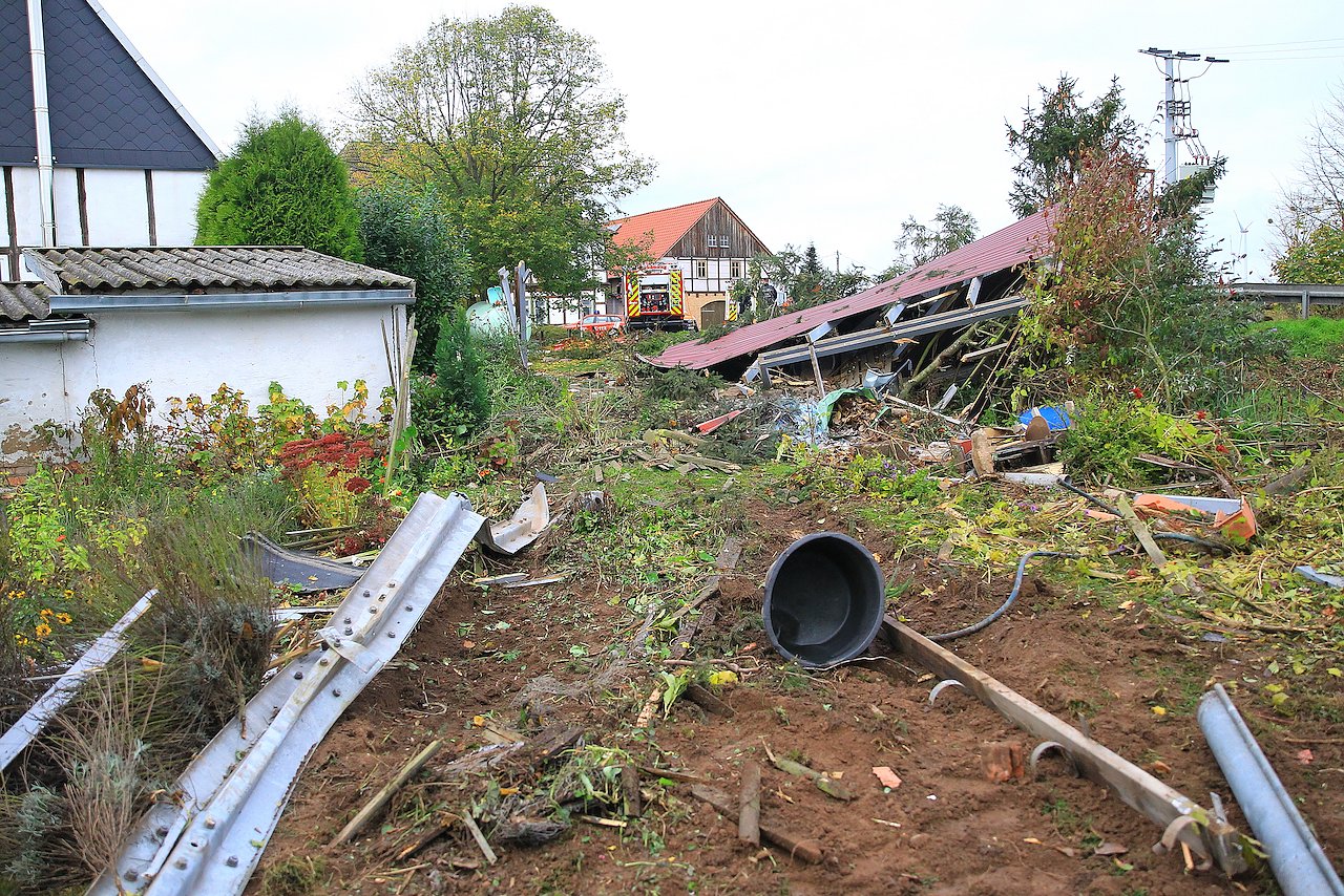 Im weiteren Verlauf prallte er in ein Carport und schob das hier geparkte Auto vor sich her ehe er nach rund 100 Metern zerstörerischer Fahrt auf dem Acker zu stehen kam.