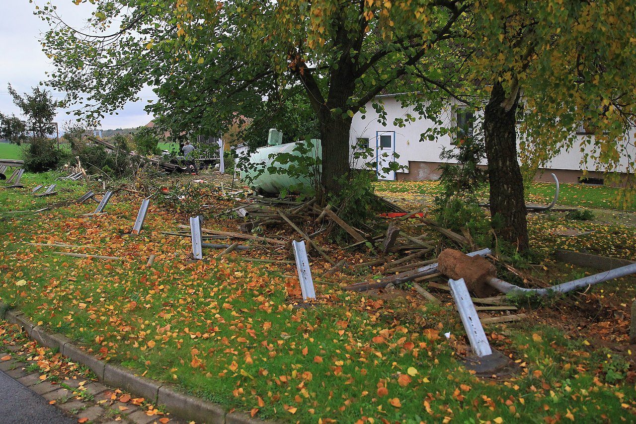 Aus bisher ungeklärter Ursache kam er in einer Kurve in Neuheide von der Straße ab, durchbrach die Schutzplanke, raste durch den Vorgarten und kollidierte hier mit einem Gastank.