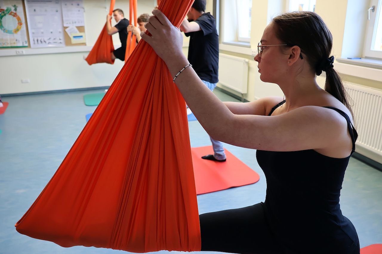 Die Auszubildenden selbst empfanden die 10 verschiedenen Stationen als gelungene bunte Mischung. So lernten sie u.a. an einer Station, dass Mundgeruch längst kein Tabuthema mehr ist. Stattdessen wurden sie von Fr. Loesche über eine effektive Mundhygiene aufgeklärt. An einer anderen Station kamen die Auszubildenden ziemlich ins Schwitzen, denn die Trainer vom INJOY Nordhausen leiteten im Stationsbetrieb zum funktionellen Ganzkörpertraining an. Um die Tiefenmuskulatur zu stärken und eine gesunde Körperhaltung zu fördern, lernten die Schüler das Pilatestraining kennen. Und wer geglaubt hat, dass man beim Tuchyoga mal Abhängen kann, hat sich gründlich getäuscht. Da kamen im Anschluss Entspannungstechniken, angeleitet von Frau Kouschil, gerade richtig, um den Körper zur Ruhe zu bringen.