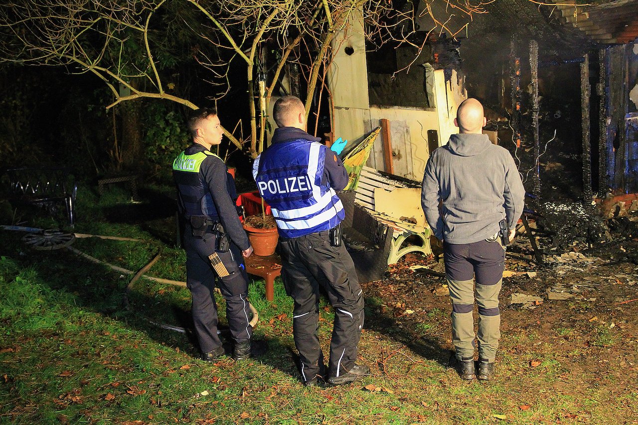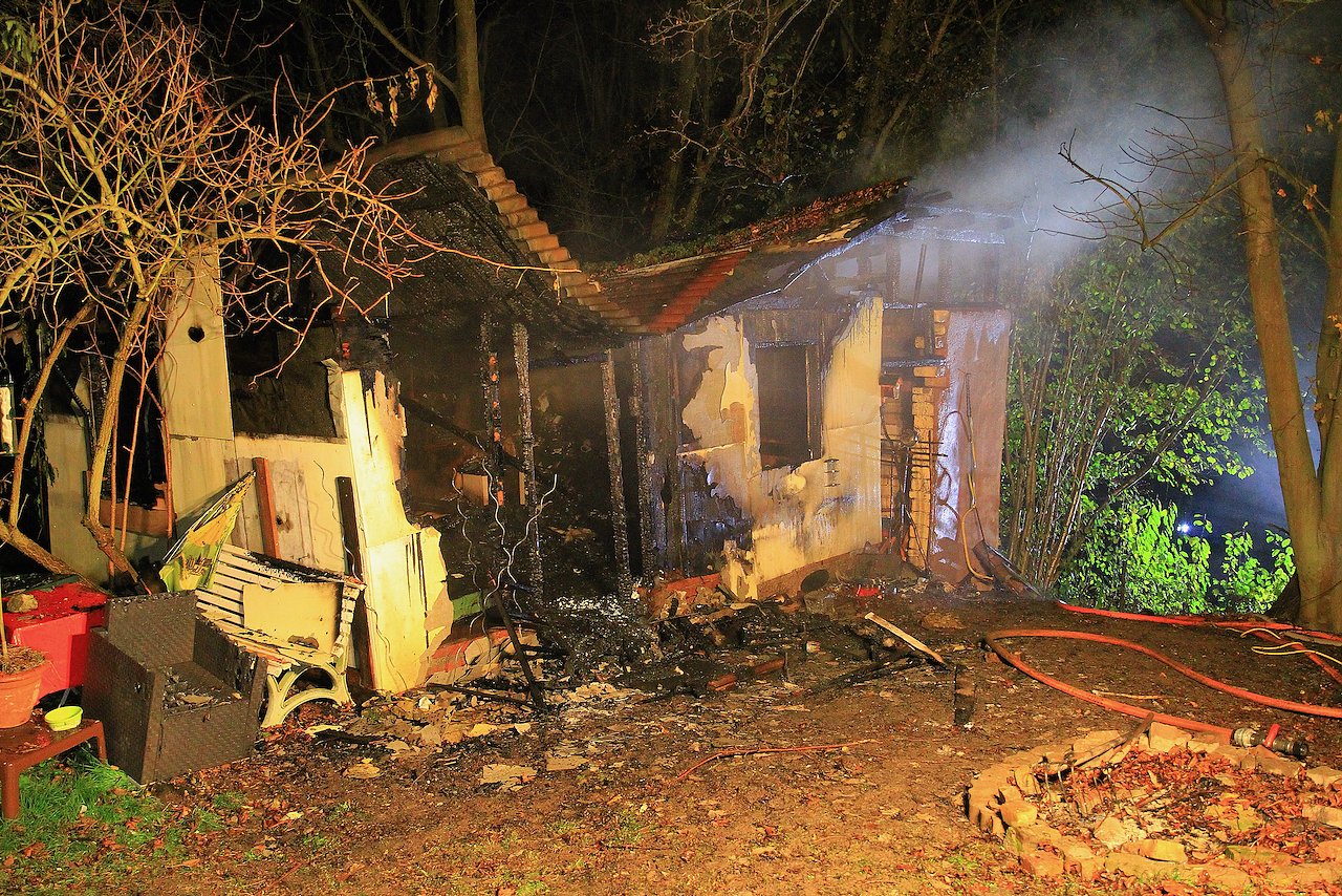 Von der Straße bis zum Brandobjekt sind es gut 75 Meter. Schläuche und Scheinwerfer müssen den Berg hochgetragen werden, nasses Laub und hohes Gras erschweren zudem, einen sicheren Weg zu finden. Zu retten ist die Gartenlaube, trotz schnellem Handeln der Einsatzkräfte, nicht mehr. Sie brennt völlig aus.
