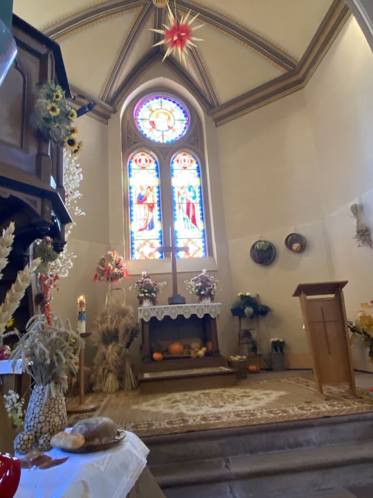 In den Südharz trieb es uns am 16. Oktober wieder einmal. Die kleine Gemeinde Neudorf in Sachsen- Anhalt gehört heute zur Stadt Harzgerode. Heute leben da ca. 670 Menschen. Freundlich wurden wir vom zuständigen Seelsorger und dem Leiter der Heimatstube empfangen. In der Kirche St. Peter und Paul, die in der heutigen Form im Jahr 1887 errichtet wurde, erläuterte und der Priester, der auch eine Opernsänger Ausbildung genossen hat, die Geschichte der Gemeinde, die bereits früh durch den Bergbau geprägt wird, bis zum Heute. Im Grubenrevier Pfaffenberg wurden silber- und bleihaltige Erze abgebaut. Der Bergbau endete dann anfangs des 20. Jahrhunderts. Im Anschluss ließ er die Orgel und seine Stimme erklingen. Ich war von diesem Empfang begeistert. Die Kirche war liebevoll ausgeschmückt und sogar beheizt. Nicht überall werden wir so empfangen. Auch in der Heimatstube zeigte uns deren Leiter die zahlreichen von den Bewohnern zusammengetragenen Gegenstände, die im Haushalt und vor allem im Bergbau benötigt wurden. Nun war es Zeit aufzubrechen in das alte Bergbaurevier Pfaffenberg. Die hier zahlreich vorhandenen Stollen und für den Bergbau wichtigen einstigen Plätze sind durch gelbe Schilder in Tannenform gekennzeichnet. Darauf sind wichtige Informationen vermerkt.