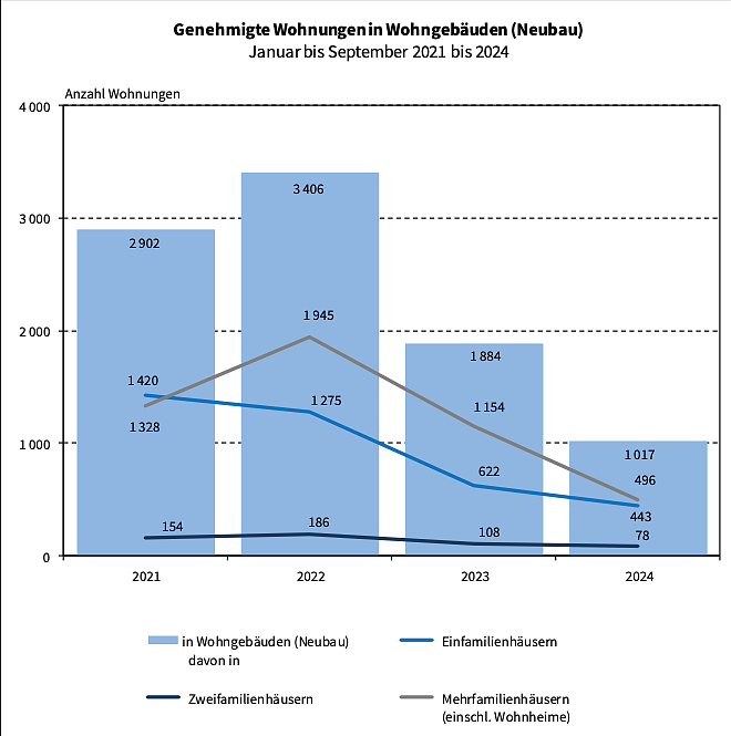 Die bis September 2024 registrierten 618 Wohnungen, die durch Um- oder Ausbaumaßnahmen in schon bestehenden Wohngebäuden dem Wohnungsmarkt wieder zugeführt werden sollen, ergeben addiert mit den Neubauwohnungen 1 635 Wohnungen. Im Vergleich zu 2023 wurden 845 Wohnungen weniger genehmigt, was einem Rückgang im Wohnungsbau von 34,1 Prozent entspricht.