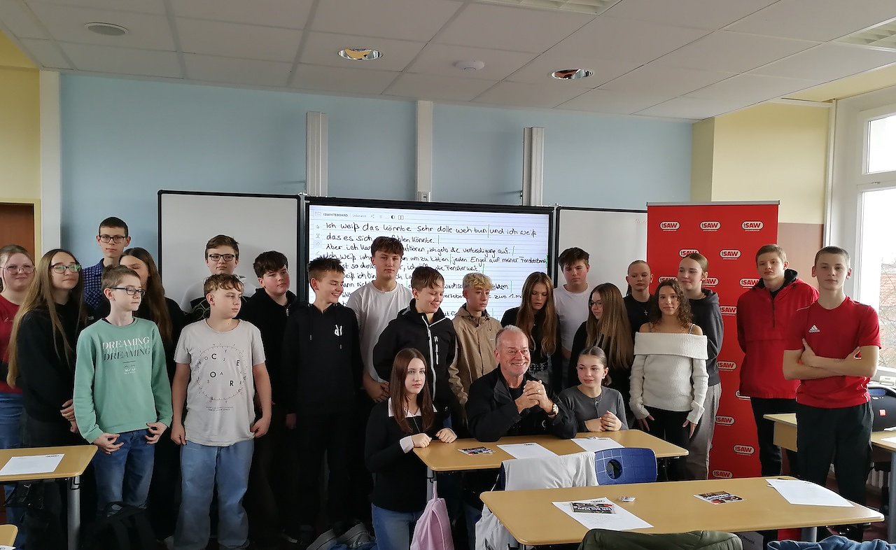 Ganz spannend und of course in English gestaltete Ted Stanetzky die besondere Englischstunde mit den Schülern. Zunächst aber konnten wir uns das Lied gemeinsam anhören: Coldplays Feels like I’m falling in love. Danach übersetzten einzelne Schüler die Zeilen des Liedtextes mit Unterstützung durch ihre Mitschüler. Als dies dann zur vollsten Zufriedenheit geschehen war, hieß es mutig sein. Einige Schüler trauten sich die Übersetzung auf dem Mikrofon einzusprechen, damit diese dann am 29.11.24 um 6:50 Uhr bei Radio SAW ausgestrahlt werden kann. Im Anschluss durften noch Fotos mit Ted Stanetzky gemacht werden. Auch Autogramme wurden fleißig als Andenken gesammelt.