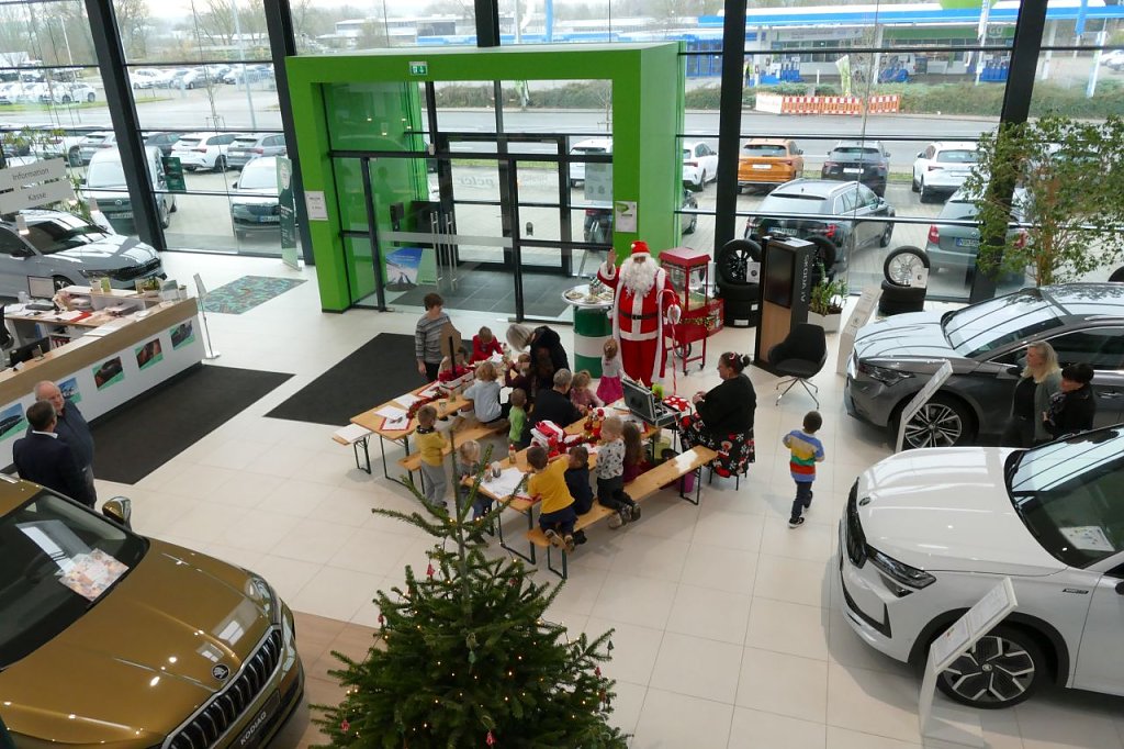 Mit großer Begeisterung schmückten die Kinder gemeinsam mit Vorstand Uwe Kramer und Centerleiter Torsten Wiesner den Weihnachtsbaum der Autowelt. Besondere Unterstützung bekamen sie vom Weihnachtsmann höchstpersönlich, der den Kindern aufmerksam lauschte, als sie ihm voller Stolz ein Gedicht und ein Lied vortrugen.