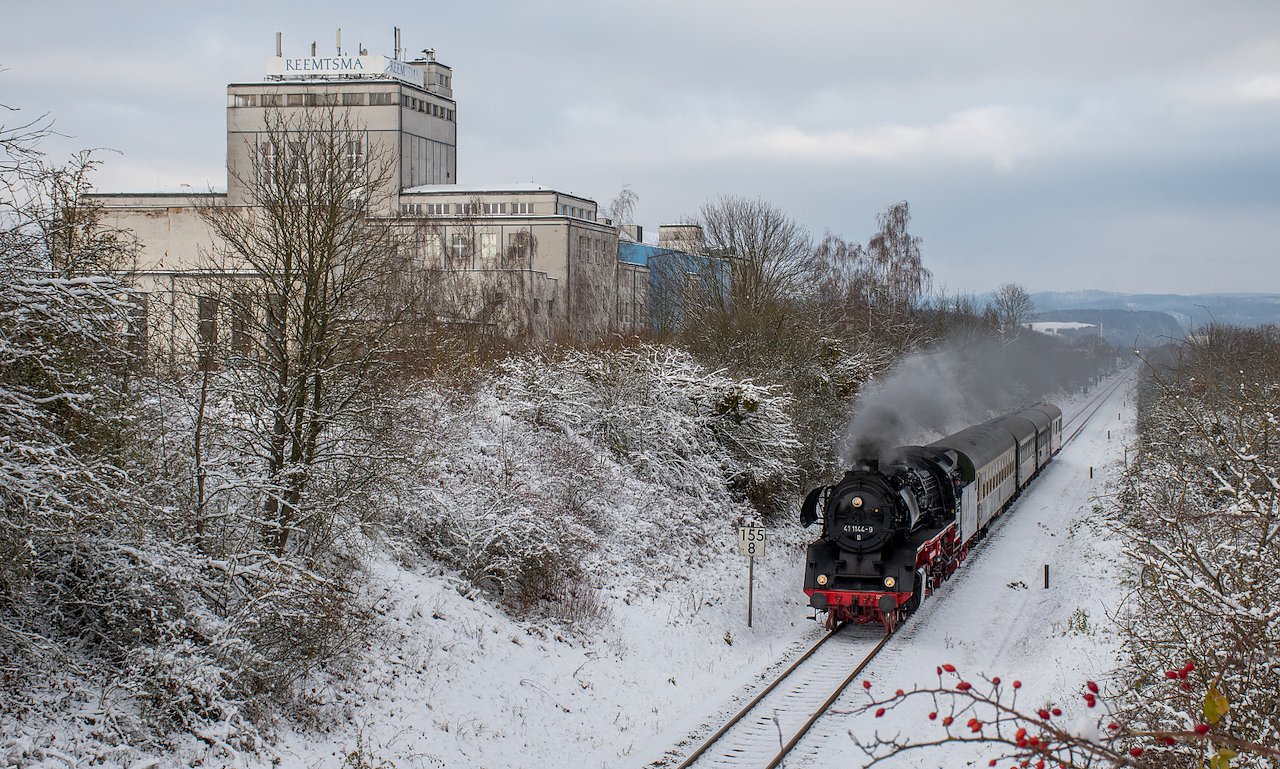 Bis zum 3. Dezember 2024 haben sich 4086 Leserinnen und Leser das Foto angesehen und somit hat die Aufnahme es auf Platz 1 geschafft. Der Text zum Foto lautete: Hier eine Aufnahme der 41 1144 der IGE Werrabahn mit einem Sonderzug auf Harzrundfahrt bei der Nordhäuser Tabakfabrik. Der Zug verkehrte am 02. Dezember 2023 von Halberstadt aus einmal rund um den Harz."