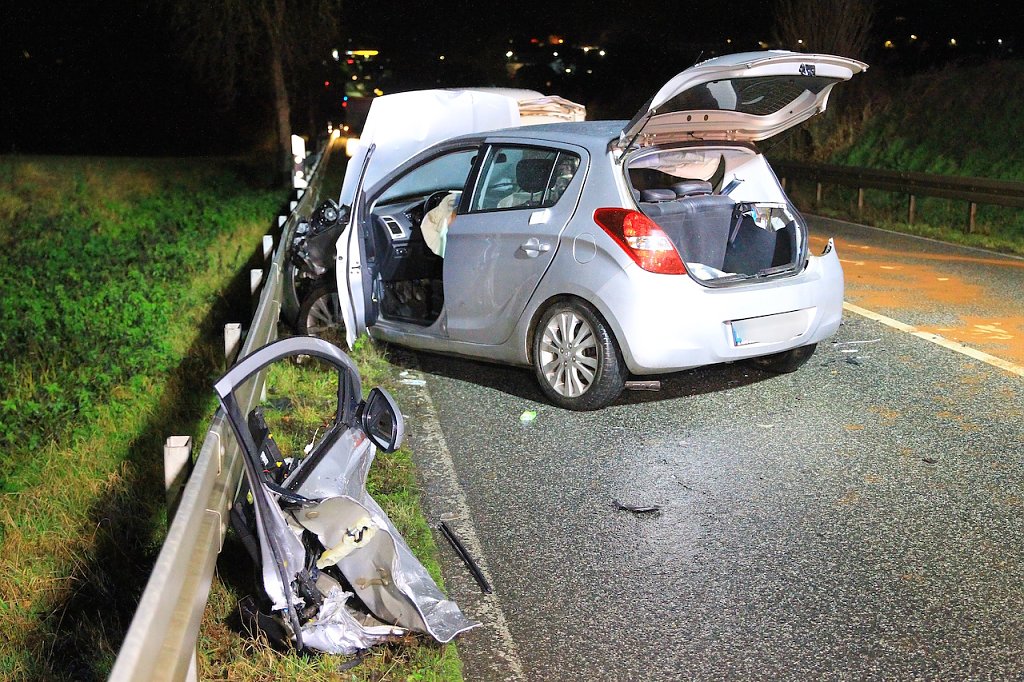 Aus bisher unbekannter Ursache kam er nach links auf die Gegenfahrbahn. Der im Gegenverkehr befindliche Volvo versuchte einer Kollision auszuweichen und prallte an die Schutzplanke. Der Hyundai prallte in die hintere rechte Seite des Volvos. Dadurch kippte der Volvo auf die Fahrerseite und rutschte über den Asphalt.