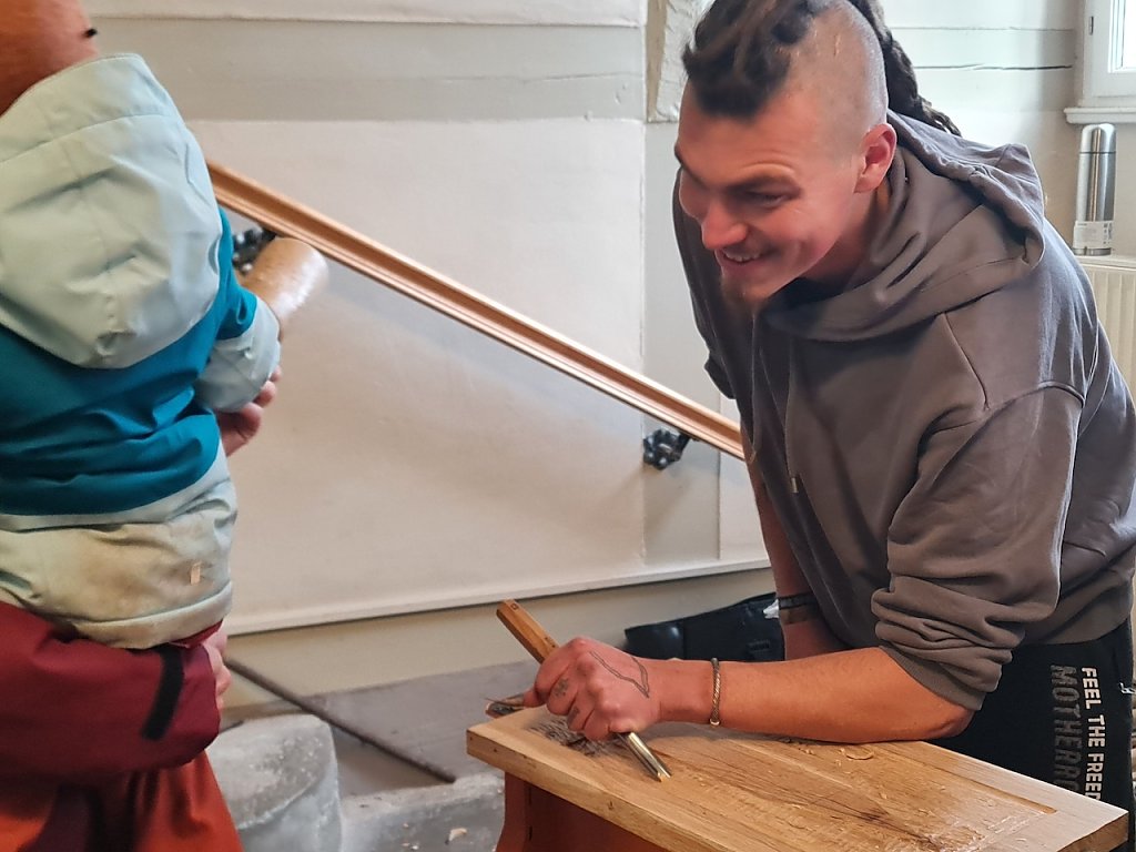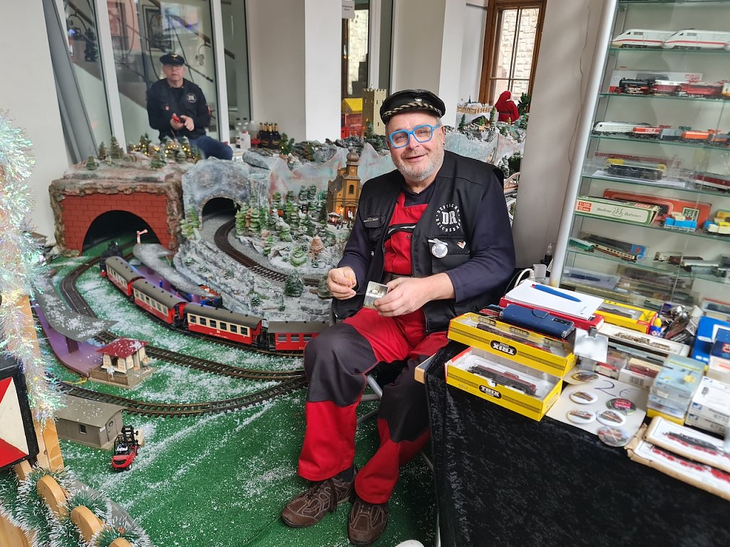 Im Rathaus waren wieder Kai Ballhause und Uwe-Fred Kaufmann mit einer wunderschönen Modelleisenbahnstrecke. "Einblicke von Nordhausen, Bad Frankenhausen dem Kyffhäuser und der Burgruine Hohnstein zeigen wir hier auf unserer Strecke", erläutert Ballhause. "Der Bauhof hat die Elemente für die Bahnstrecke gebaut. Auch die Lebenshilfe hat nach unseren Vorgaben an der Strecke mitgewirkt und mitgebaut."