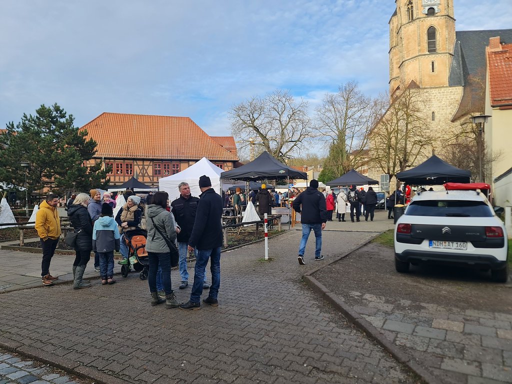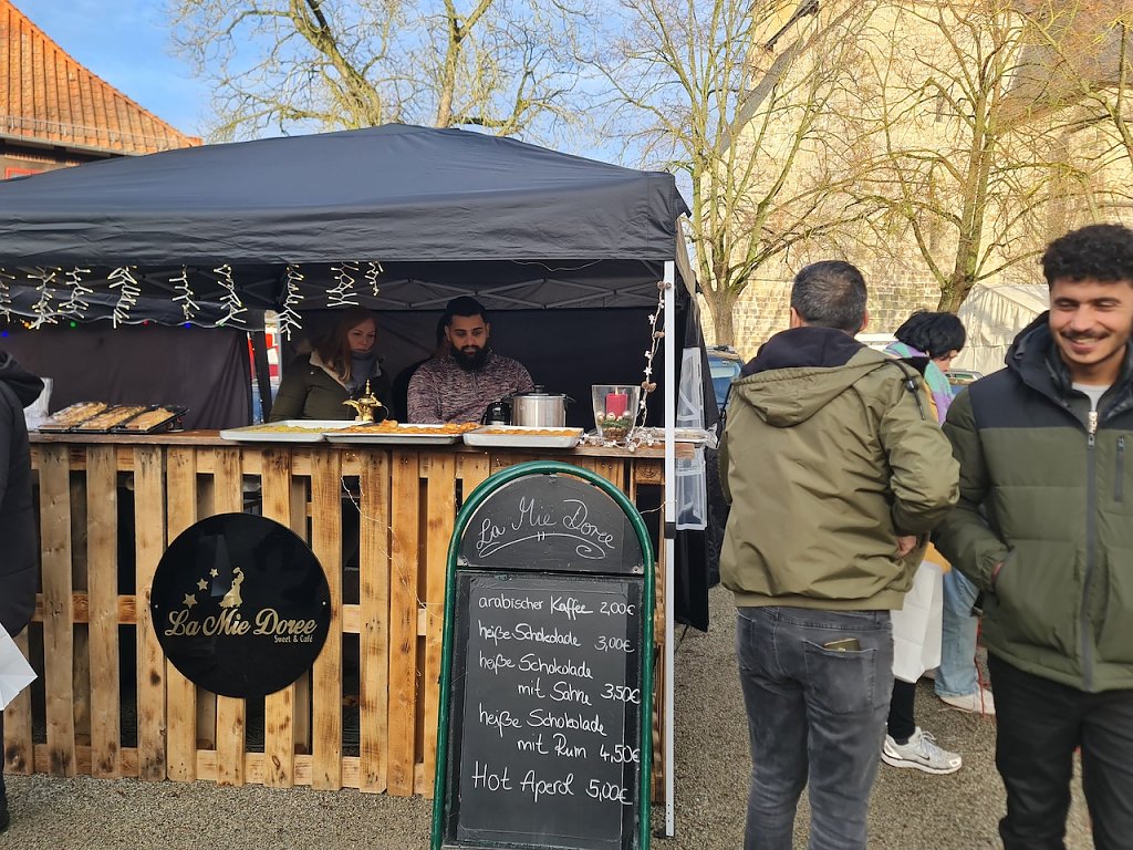 Ein paar Schritte weiter lud die kleine Meile zum Verweilen ein. Hier trafen sich heute viele Menschen, um die Vorweihnachtszeit zu genießen. Es gab zahlreiche Stände, die Speisen und Getränke anboten. Sicher traf es sich gut, dass heute verkaufsoffener Sonntag war. Hierdurch waren generell mehr Menschen im Stadtgebiet unterwegs, was den Händlern eine Umsatzsteigerung brachte.