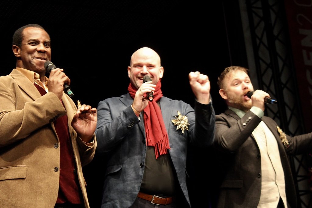 Getragen von den beiden ausgezeichnet aufgelegten Damen am Cello (Melissa Hart) und Rosalina Genchev (Piano) entfalteten die FELLAS ein weihnachtlich-unterhaltsames Programm voller Humor und Emotionen. Egal ob einzeln oder im Satzgesang übten die drei Tenöre sich in permanenter Gänsehautproduktion beim verzückten Publikum. Und das, obwohl es kein hohes C in Nessun Dormo aus Marvin Scotts Goldkehle zu hören gab. Dafür aber von Jazz, Liedermachern, Gospel und Pop wieder alles bis hin zu Gassenhauern vergangener Jahrtausende wie Irgendwo auf der Welt gibt’s ein kleines Stückchen Glück.