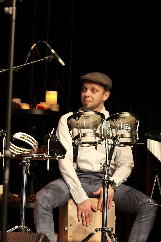 Tobias Raßbach, neu in Ensemble des Tenortrios, begleitete mit seinen Percussionsinstrumenten das Weihnachtskonzert (Foto: Eva Maria Wiegand)