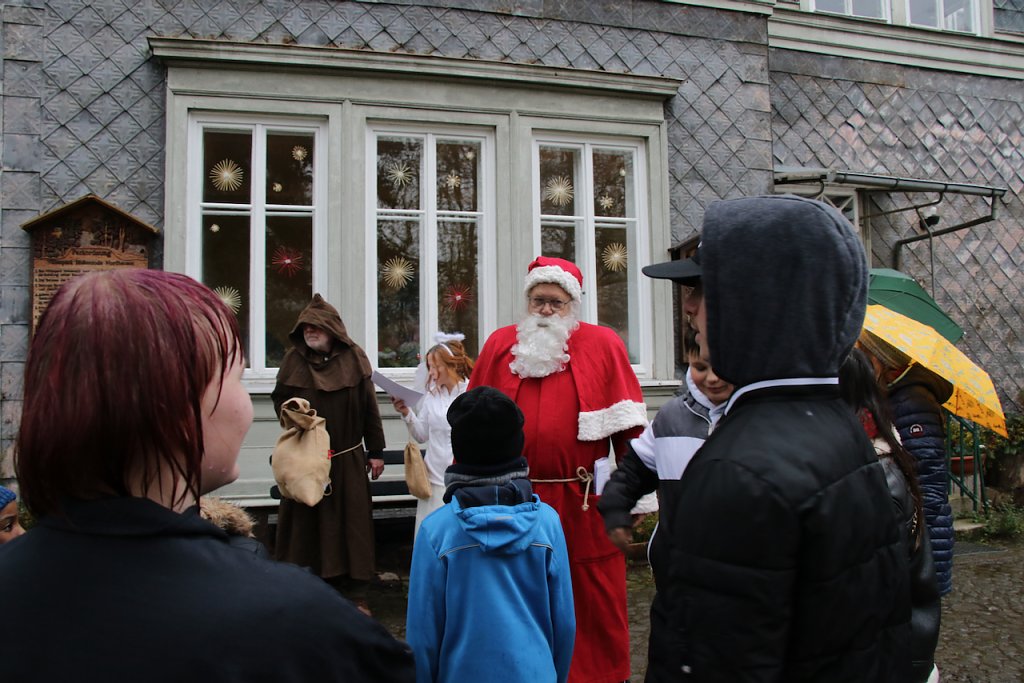 Die traditionelle Wanderung durch Hohenrode mit Weihnachtsmann, Engel und Mönch fiel zwar etwas kürzer aus, an kleinen Geschenken wurde aber trotzdem nicht gespart. Neben dem Genuss allerlei Leckereien konnte drinnen auch gebastelt und gestöbert werden, die Lebenshilfe und Konditormeister Jens Teichmann boten Weihnachtsgaben für das Auge und den Gaumen an, der Weihnachtsstollen kam aus der Bleicheröder Bäckerei Meyer. Zu guter Letzt gab es natürlich auch etwas zu hören, Anja Eisner hatte ihr großes Märchenbuch mitgebracht und rundete die festliche Atmosphäre ab.