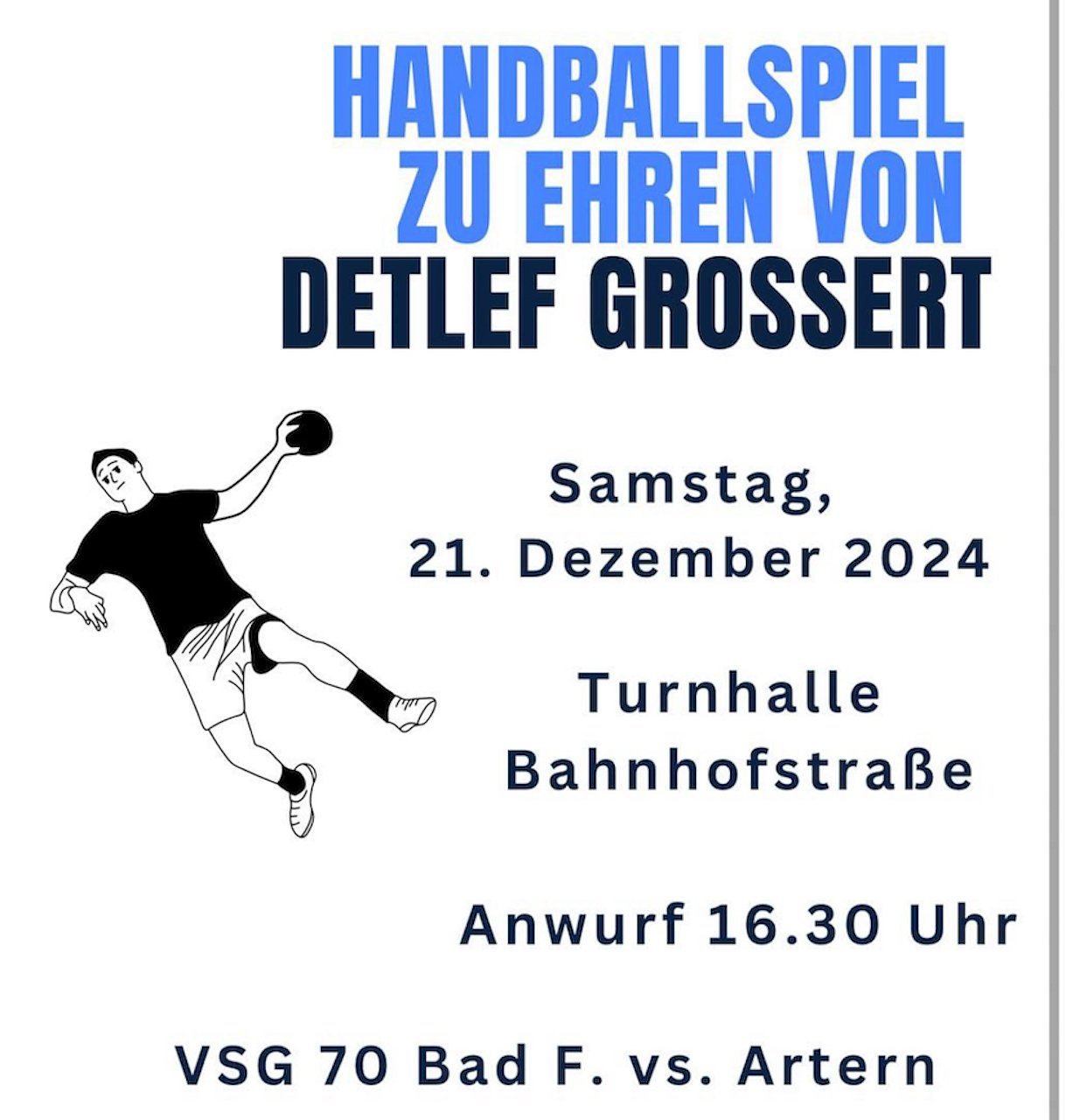 Am Samstag, den 21. Dezember findet in der Turnhalle, in der Bahnhofstrasse, in Bad Frankenhausen ein Handballspiel zu Ehren von Detlef Grossert statt. Es spielen der VSG 70 Bad Frankenhausen gegen Artern.