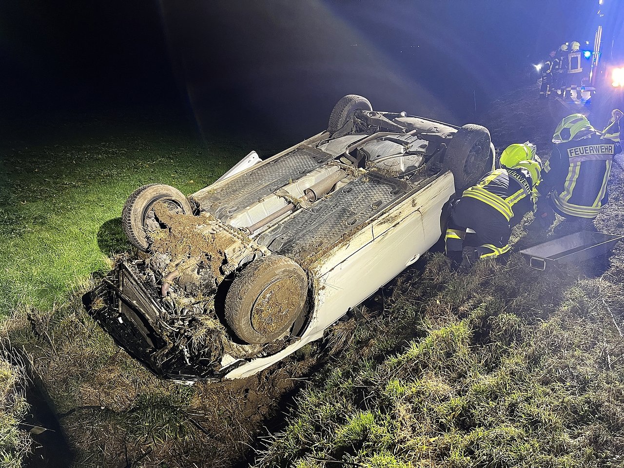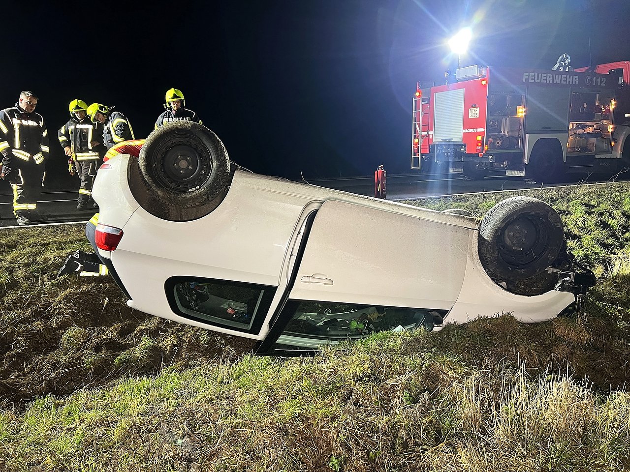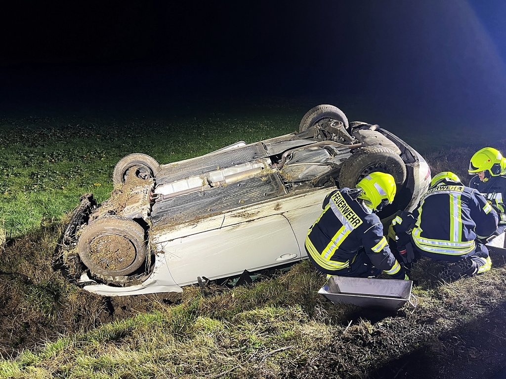 Beim Einscheren kam er mit seinem Auto aus bisher ungeklärter Ursache nach rechts von der Fahrbahn ab, geriet die Böschung hinunter, fuhr im Graben noch eine Strecke von rund 75 Meter entlang, bevor sich das Auto überschlug und auf dem Dach liegen blieb.