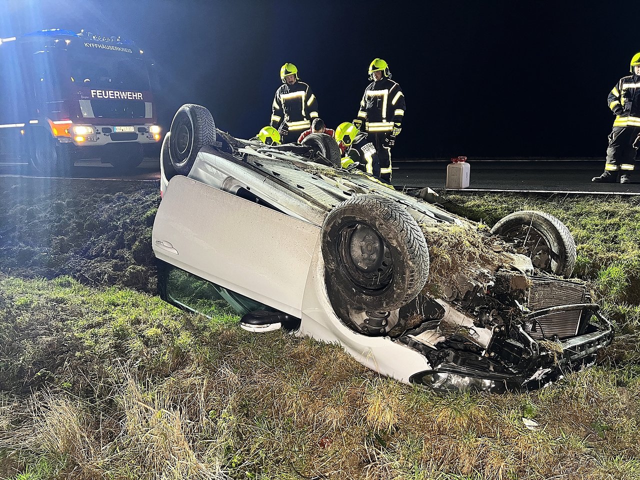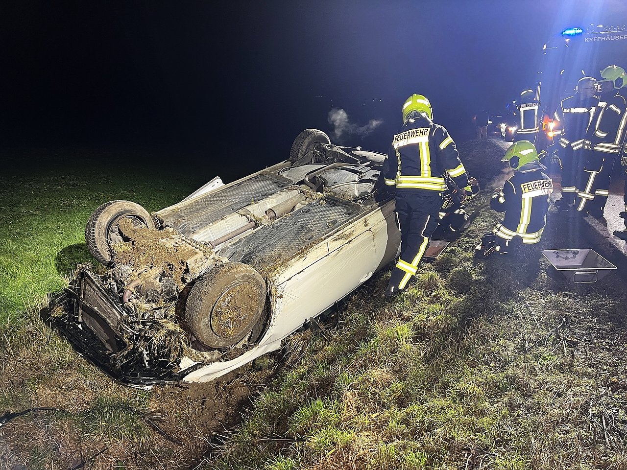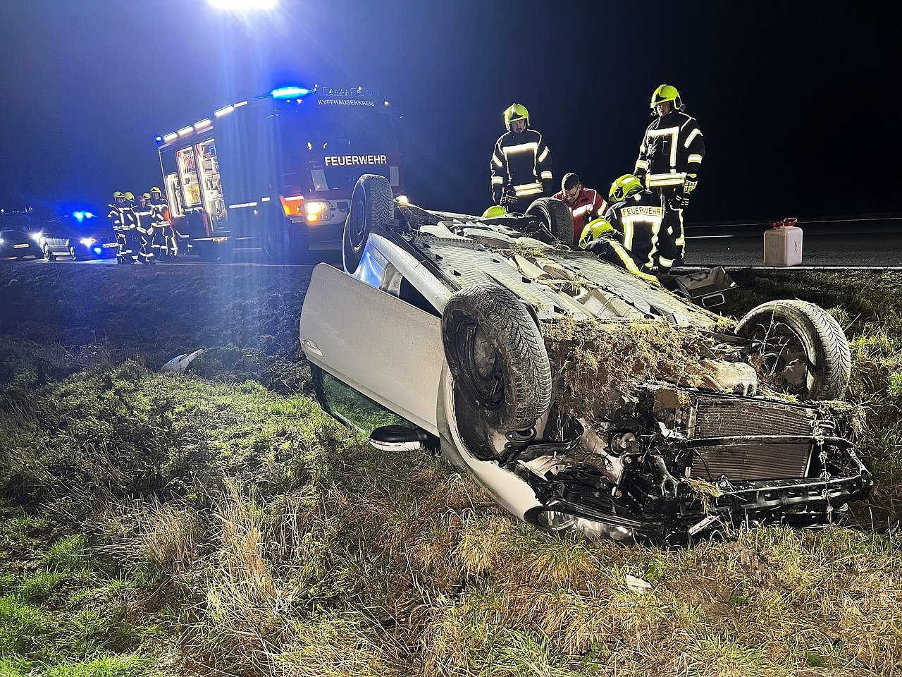 Beim Einscheren kam er mit seinem Auto aus bisher ungeklärter Ursache nach rechts von der Fahrbahn ab, geriet die Böschung hinunter, fuhr im Graben noch eine Strecke von rund 75 Meter entlang, bevor sich das Auto überschlug und auf dem Dach liegen blieb.