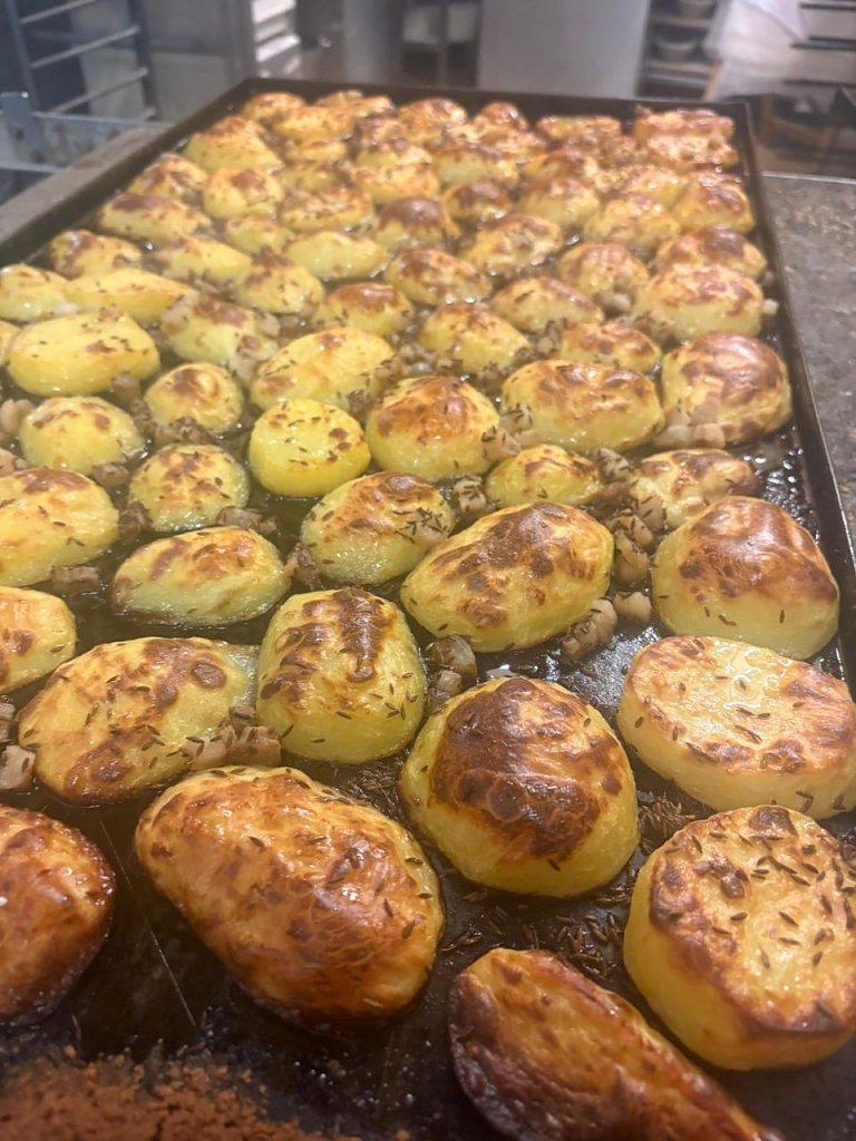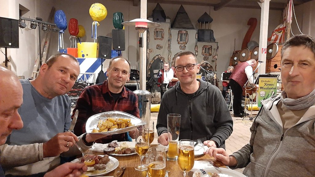 Kartoffeln wurden geschält, in Scheiben portioniert und mit Kümmel, Speck und Gewürzen auf Backbleche verteilt. Wurst und Gewürzgurken wurden geschnitten und frischer Kräuterquark und Salate wurden angerichtet. Kurz nach 19.00 Uhr konnten die Organisatoren dann ihre Gäste begrüßen und den Abend eröffnen. Die, von Bäckermeister Matthias Sievert, goldgelb gebackenen Kartoffelscheiben wurden serviert, und begleitet von zünftiger Livemusik der Görsbacher Kirmesmusikanten, ließen es sich die knapp 100 Gäste sichtlich schmecken.