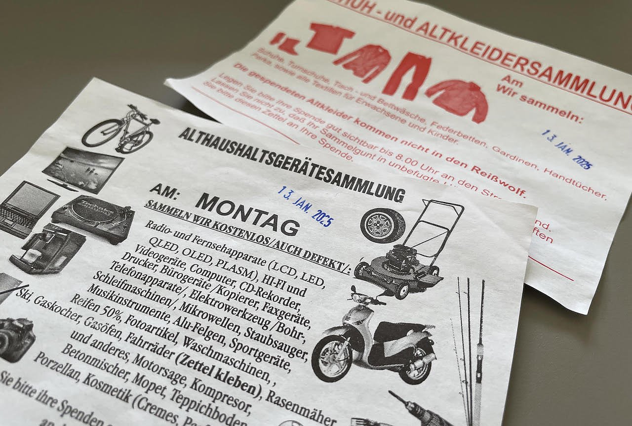 Das Team der Abfallwirtschaft erreicht immer wieder Meldungen, dass beispielsweise in Briefkästen Handzettel zu Sammlungen von Haushaltsgegenständen bzw. Schuhen und Altkleidern verteilt werden. Diese Sammlungen haben jedoch nichts mit den vom Landkreis angebotenen Entsorgungssystemen zu tun. Oftmals werden die Gegenstände nur mitgenommen, wenn diese noch brauchbar sind. Wertlose Gegenstände werden hingegen liegen gelassen oder unerlaubt in der Natur entsorgt.