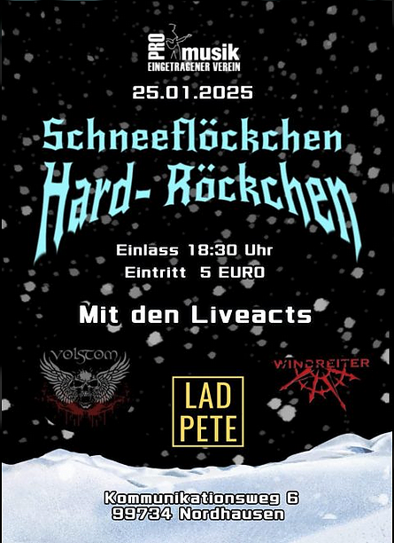 Zu tun gibt es weiterhin jede Menge, im neuen Jahr will man aber auch musikalisch ordentlich durchstarten. Los geht es schon am kommenden Samstag ab18.30 Uhr mit Schneeflöckchen, Hard-Röckchen. Mit harten Riffs und epischen Beats soll der Winterblues vertrieben werden, auf dem Programm stehen mehrere Live-Acts aus der Region, darunter Volstom (Metal), LAD PETE (Rock) und Windreiter (Hardrock).