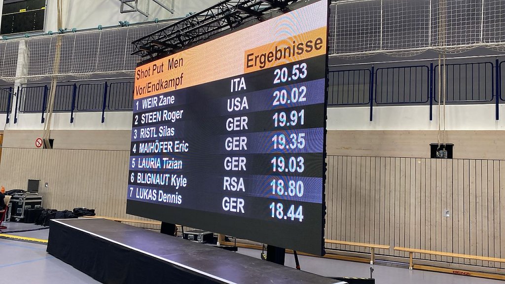 Mit drei Versuchen, die seine Kugel über die Zwanzigmetermarke wuchteten war der Italiener Zane Weir heute Nachmittag beim Kugelstoßen Indoor in der Nordhäuser Wiedigsburghalle das Maß aller Dinge. Wieder, muss dazu gesagt werden, denn bereits im vergangene Jahr dominierte er die Männerkonkurrenz. Auch wenn ihm heute kein 21-Meter-Stoß gelang überzeugte Weir mit drei Versuchen jenseits der 20 Meter. Schließlich geht die Siegerweite von 20, 53 Meter in die Annalen der Nordhäuser Indoor-Wettkämpfe ein. Roger Steen aus en USA wurde mit 20,02 Zweiter und den Bronzerang sicherte sich als bester Deutscher Silas Ristl, der die Kugel auf immerhin 19,91 Meter durch die Luft beförderte.