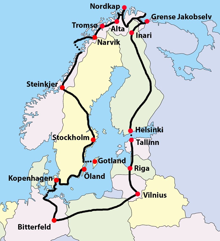 Von Bitterfeld aus durchquerte er Polen und das Baltikum, setzte mit einer Fähre nach Helsinki über, um dann schließlich über den Osten von Finnland in die Arktis zu gelangen. Er erkundete den wilden Norden Norwegens und erreichte schließlich das Nordkap, aber auch den nördlichsten Punkt des sogenannten eisernen Vorhangs an der russischen Grenze.