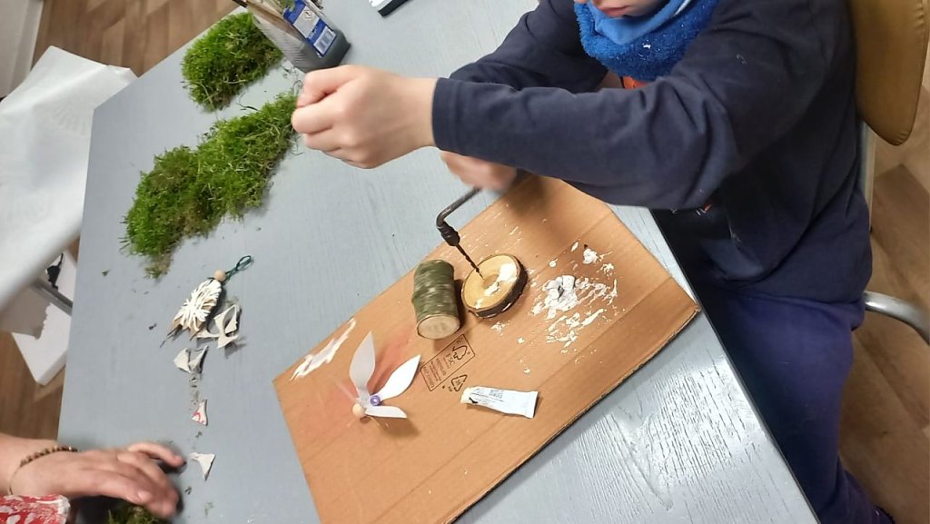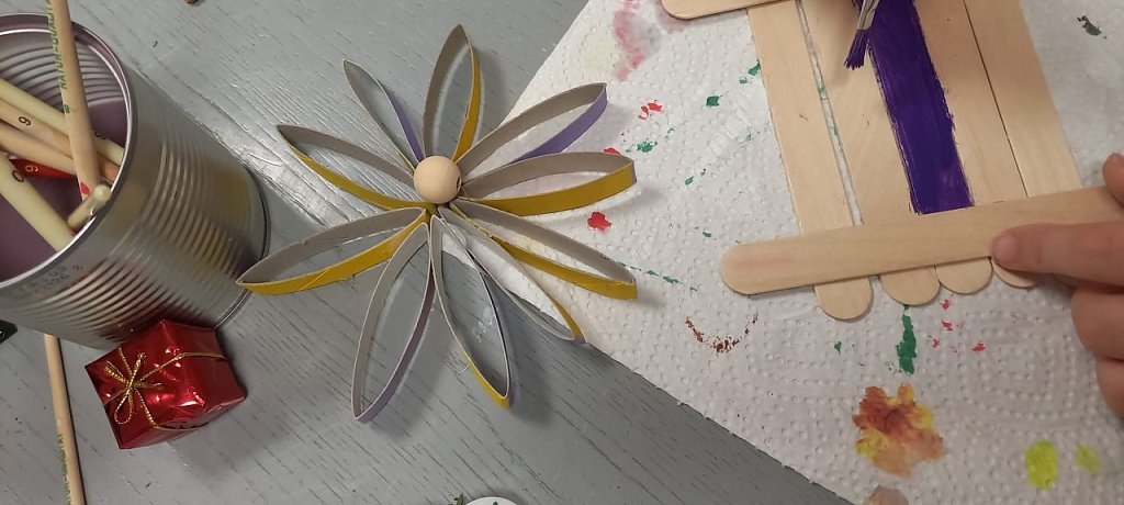 Dabei unterstützt eine ehrenamtliche Helferin, die Kinder bei der Umsetzung ihrer Ideen und bietet je nach Jahreszeit ein Themenbasteln an. So haben die Kinder im Winter zum Beispiel die Möglichkeit aus alten Klopapierrollen einen eigenen Adventskalender zu fertigen.