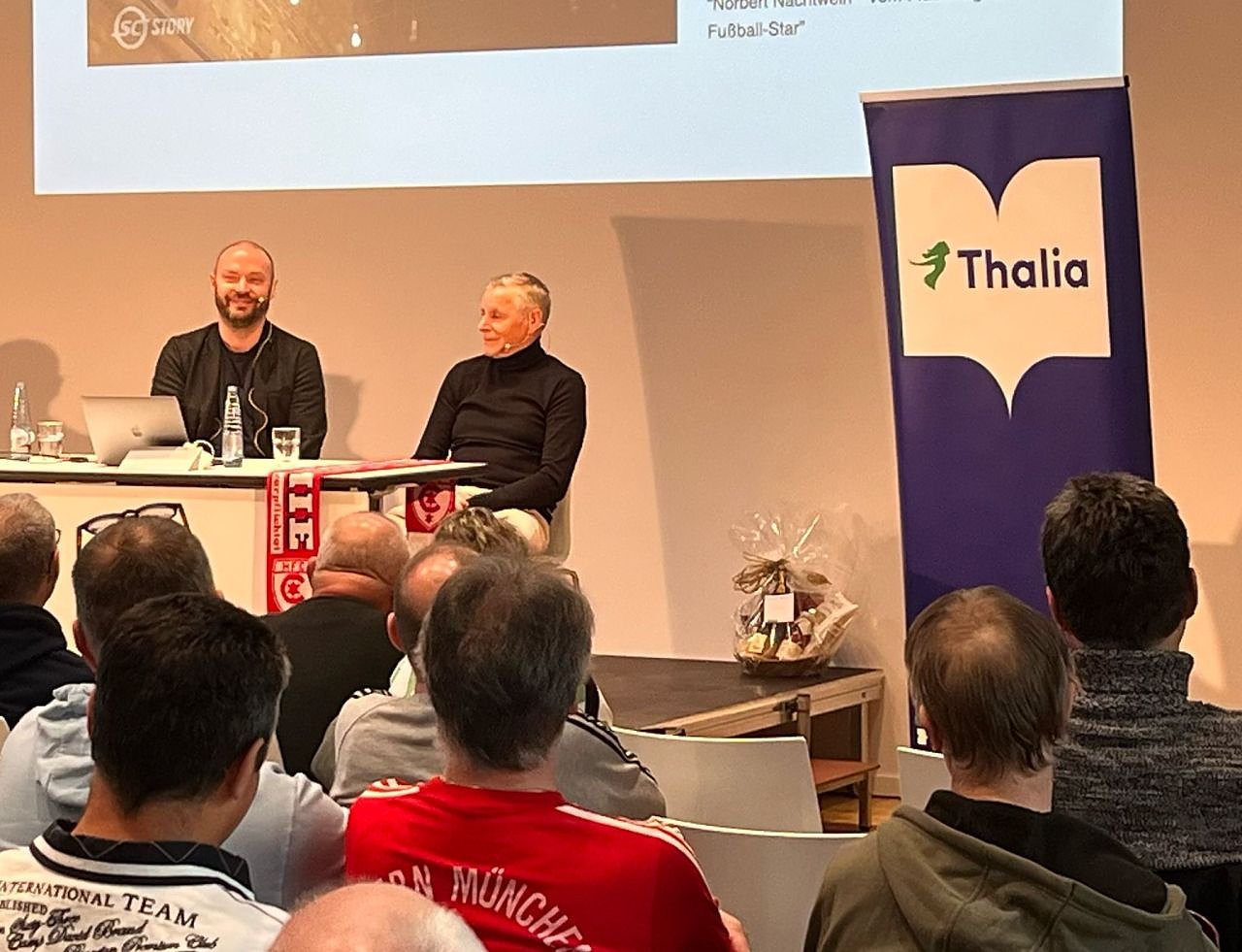 Viele Fragen aus dem Publikum gab es zu seiner Fußballer Laufbahn, sowie zu den vielen bekannten Persönlichkeiten, die ihn auf dem Weg begleiteten. Seine Stationen waren unter anderem Eintracht Frankfurt, Bayern München und Cannes. In Cannes spielte Nachtweih noch mit Zinedine Zidan zusammen. Über ihn sagte er, dass es nicht abzusehen war, dass er ein so großartiger Fußballer wird, da er zu schmal war und kaum in der ersten Mannschaft ein gespielt hatte.