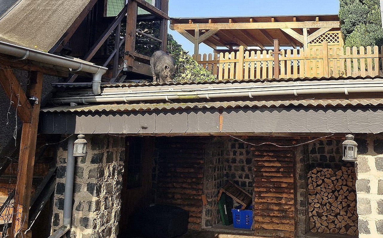 Besagtes Hängebauchschwein war durch eine Anwohnerin auf ihrem circa drei Meter hohem Garagendach festgestellt.