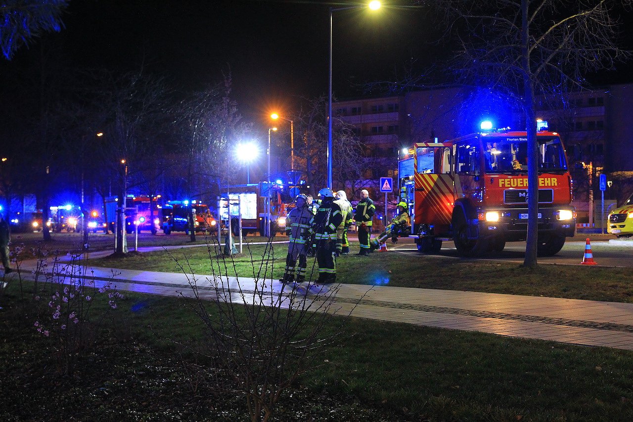 Gegen 21 Uhr alarmierte die Rettungsleitstelle die Nordhäuser Berufsfeuerwehr zu einer unklaren Rauchentwicklung in einem Hochhaus in der Stolberger Straße 133 in Nordhausen. Kurz darauf wurde das Alarmstichwort erhöht und weitere Feuerwehren der Stadt Nordhausen nachalarmiert.