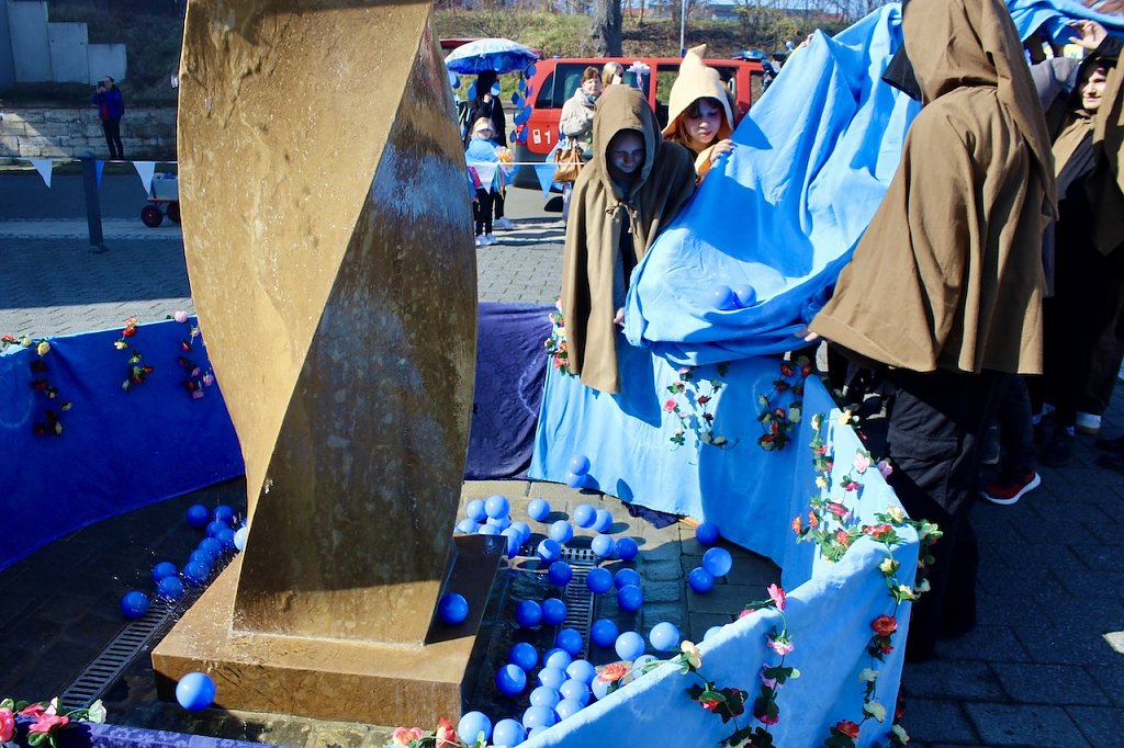 Durch die Innenstadt, am Rathaus vorbei bis hin zur Celenus-Klinik im Kurpark führte ihr Weg, der an den Straßenrändern von Eltern, Freunden und Passanten gesäumt war. Von Klinikdirektor Prof. Dr. Jörg Frank Richter wurden sie vor der Kurklinik empfangen und jedes Kind erhielt einen wasserblauen Rucksack zum Geschenk. In Begleitung von Bürgermeister Reinz, Kurdirektorin Rudolph und der Rosenkönigin Maxima ging es von dort aus weiter bis zur Friederiken Therme. Dort stimmten alle am geschmückten Brunnen ein Geburtstagslied auf den Status als Heilbad an und warfen symbolisch die Regentropen in den den Wasserspender.