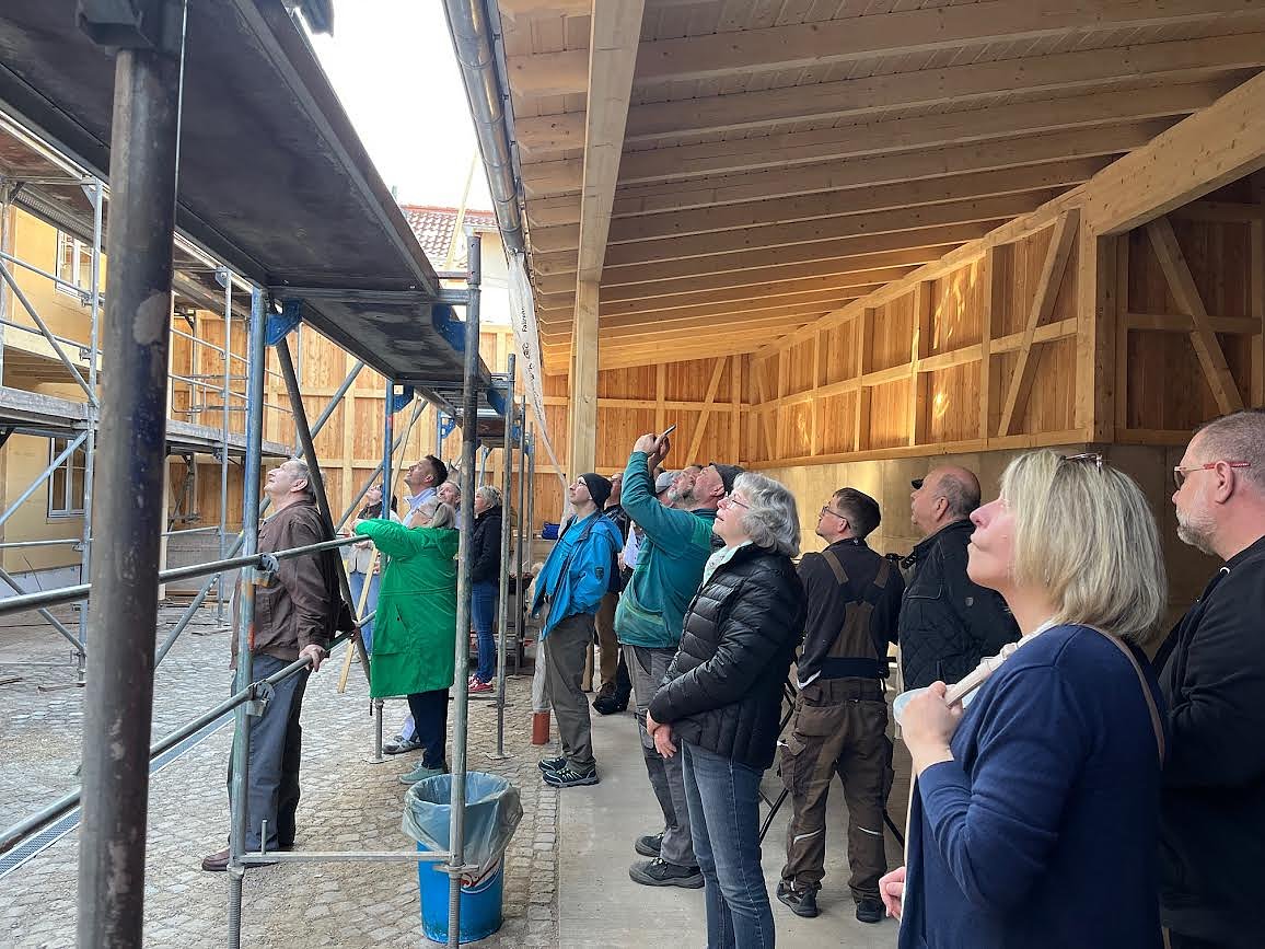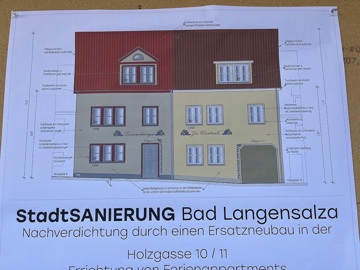 Bei Bohrungen auf dem Grundstück im Vorfeld der Bauarbeiten wurde festgestellt, dass die erste Bebauung auf das Jahr 1400 zurückgeht. Gemeinsam mit dem Architekturbüro Kühmstedt wurde das Projekt angegangen. Die Idee war, äußerlich in der historischen Ansicht von zwei Gebäuden zu bleiben, obwohl es im Inneren ein Haus mit sechs Wohnungen wird, berichtete die einheimische Architektin Theresa Kühmstedt. Seit Mai vergangenen Jahres liefen die Abriss- und Vorbereitungsmaßnahmen, ehe es mit dem Neubau ans Werk gehen konnte. Umgesetzt wird der Bau hauptsächlich von Zimmermann Volker Ehrlich aus Döllstedt, der auch die Holzbauweise des Hauses ins Spiel brachte. Als besonderes Geburtstagsgeschenk für die Bauherrin konnte er an ihrem heutigen Geburtstag nach einer nur dreiwöchigen, intensiven Bauzeit das Richtfest und den Segen fürs Haus als besonders Geschenk offerieren.