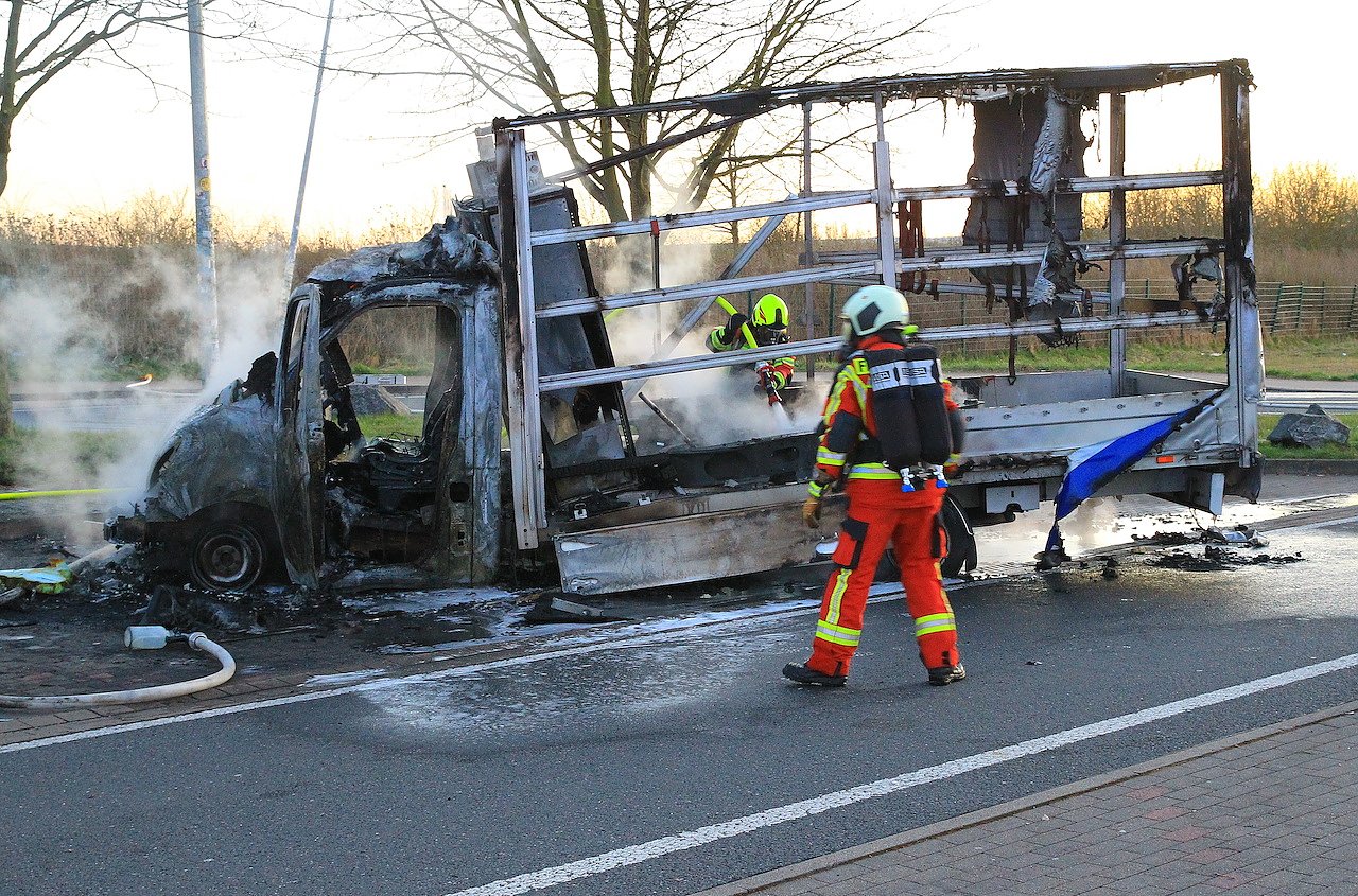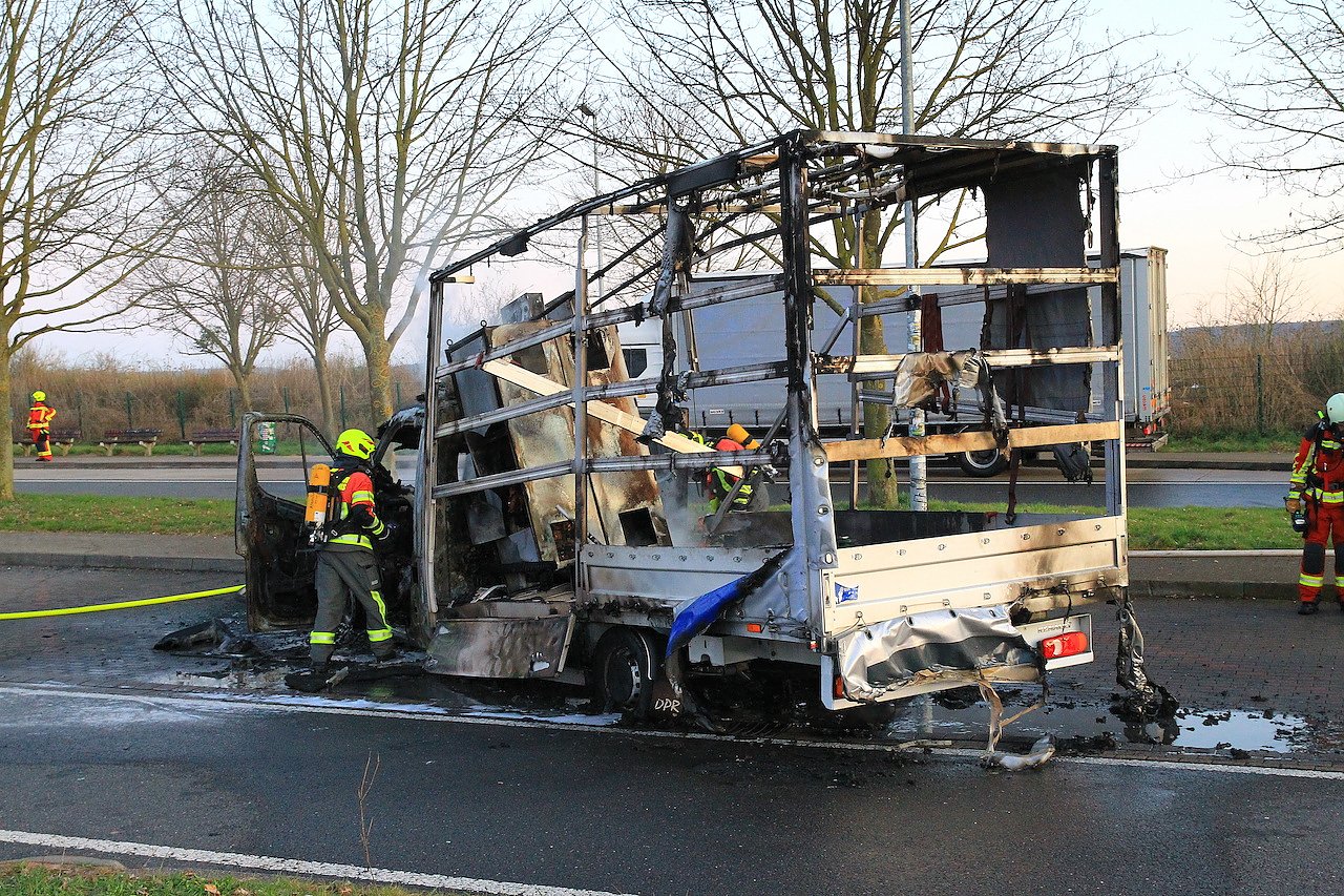 Hier geriet aus bisher ungeklärter Ursache ein LKW in Brand. Beim Eintreffen der Einsatzkräfte stand das Fahrzeug bereits in Vollbrand. Trotz des schnellen Eingreifens der Feuerwehr konnte nicht verhindert werden, dass der Truck komplett ausbrannte.
