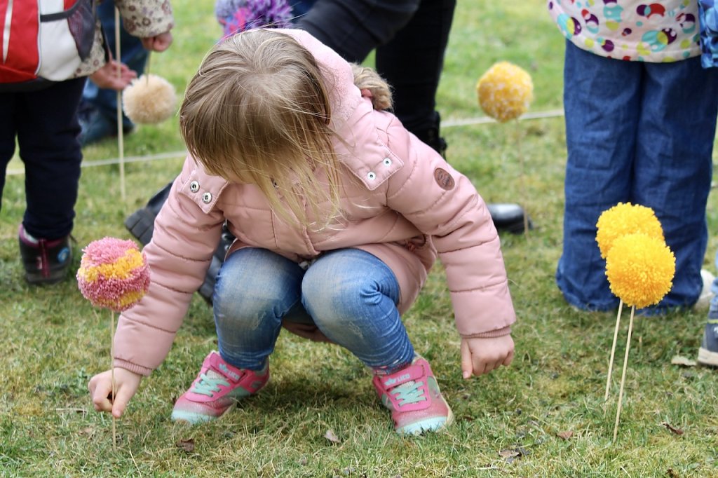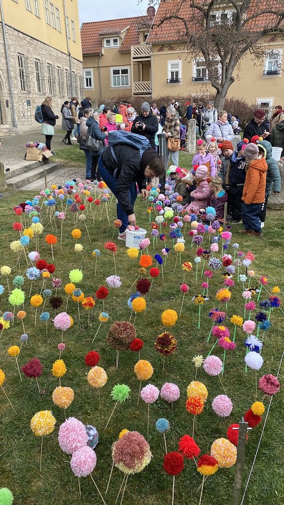 140 Bommelblumen aus dem Büro CM wurden an die Salza Knirpse verteilt. Damit wurden vor dem Umzug die Ostersträucher vor dem Rathaus geschmückt.