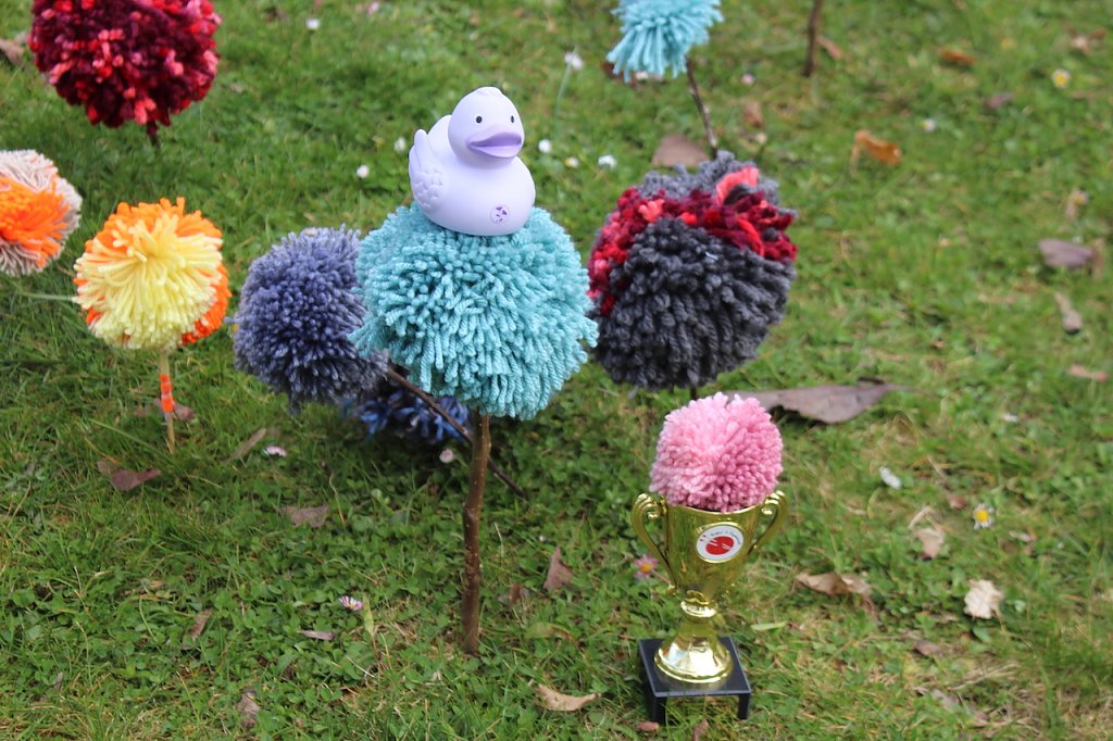 Diese brachten heute knapp 2000 Bommelblumen mit vor das Rathaus, um sie nicht wie im vergangenen Jahr in und um die Bäume der Stadt zu drapieren, sondern damit an zwei unterschiedlichen Orten die Wiese zu schmücken.