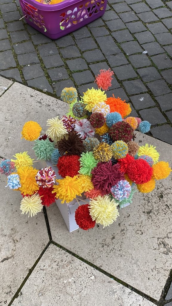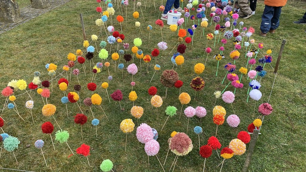 An alle Hundebesitzerinnen und -besitzer. Die Kinder und alle an der Aktion Beteiligten haben sich sehr viel Mühe gegeben, die wunderschönen Bommelblumen zu basteln oder wieder herzurichten. Es wäre eine große Missachtung der Gemeinschaft gegenüber, wenn dies durch Hundehinterlassenschaften zerstört werden würde. Die Wiese vor dem Museum musste in den vergangenen Tagen erst einmal vor Unmengen Hundekot gesäubert werden. Nicht so toll.