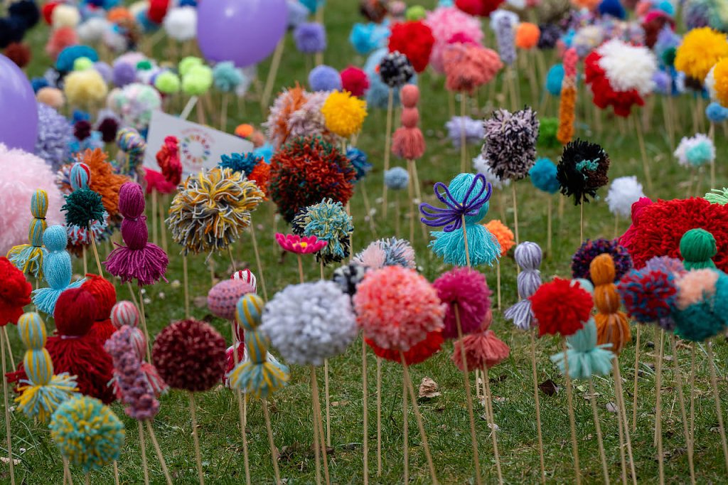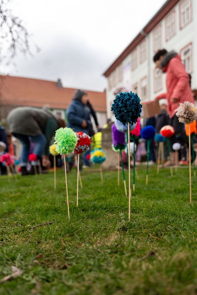 Fleißige Händen sorgten für bunte Frühlingsbommeln, die der noch nicht so bunten Natur zur Farbenpracht verhalfen. Oder wie Großmeister Goethe bei der heutigen Aktion zur Natur gesagt hätte: Doch an Blumen fehlt’s im Revier, sie nimmt wollene Bommeln dafür.