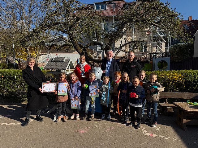 Zur sportlichen Preisübergabe versammelten sich neben der Kitaleitung der Ilfelder Rappelkiste Anna Müller und den Vorschülern mit Erzieherin, der erste Beigeordnete des Landkreis Nordhausen Stefan Nüßle und der Sportjugendkoordinator des Kreissportbund Nordhausen Viktor Vollmer.