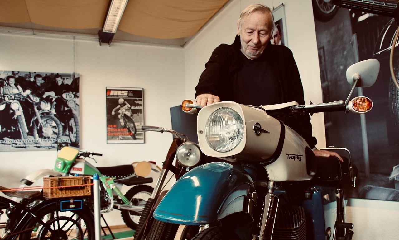 Auch eine Scorpion ist mit dabei, eines der jüngeren Motorräder, die in Zschopau nach der Wende gebaut wurden, jetzt unter dem Namen MuZ, dem Motorrad- und Zweiradwerk. Trotz neuer Modelle können die Ostdeutschen aber nicht mit den großen Konkurrenten im neuen Markt mithalten, Suzuki, Honda, BMW und Co. laufen der alten Marke den Rang ab. Bis 2008 schleppt man sich noch dahin, erzählt Franke, dann gehen auch in Zschopau die Lichter aus.