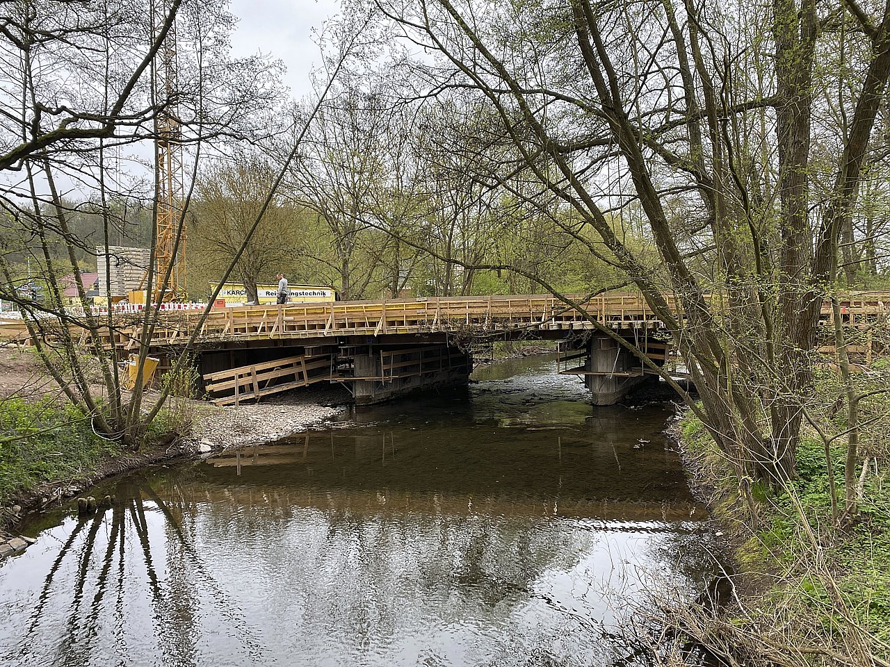 Der Bereich ist weiterhin für den Verkehr voll gesperrt, für den Fußgängerverkehr steht eine provisorische Behelfsbrücke zur Verfügung.