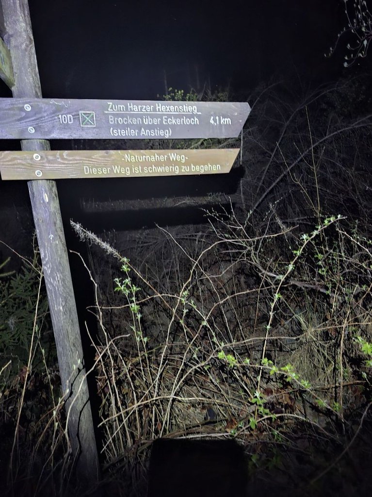 Beim Brockenbauern in Tanne gab es kurz vor Schließung 21 Uhr noch kurz ein alkoholfreies Weizen, weiter über den Schierker Weg Richtung Elend. So langsam wurde es dunkel, die Wege gingen teils durch feuchte Senken im Wald, Zeit sich per Stirnlampe und ausreichender Geräuschkulisse bei der Tierwelt bemerkbar zu machen. Im letzten Jahr hatte ich hier eine Begegnung mit einer größeren Wildschweinrotte. In diesem Jahr sind sie angesichts Lichts und grauslichem Singen wohl geflüchtet.