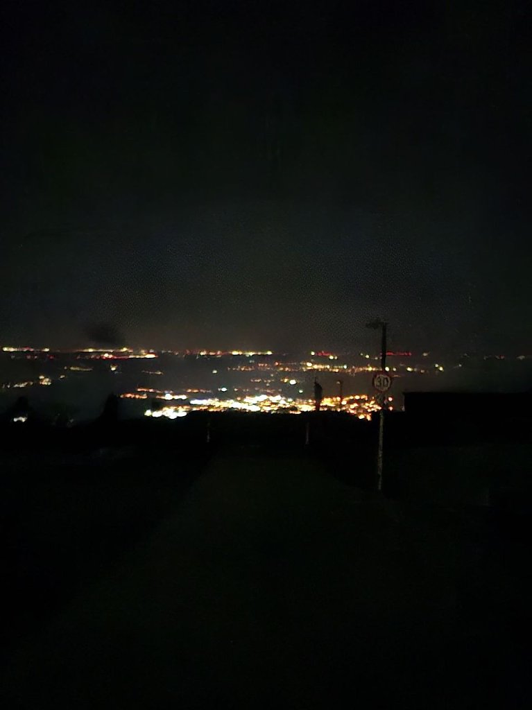 Nach 42 km und knapp 9 Stunden erreichte ich gegen 1 Uhr den Brockengipfel. Mit viel Glück hatte ich eine windstille, sternenklare Nacht mit einer tollen Aussicht. Es ist schon erstaunlich wie hell die Orte nachts um 1 Uhr leuchten. Ich war schon oft zu Sonnenauf- und untergängen auf dem Brocken, den nächtlichen Blick finde ich am beeindruckendsten. Der Einzige der mir auf dem Plateau begegnete war ein junger Fuchs der mich länger erstaunt ansah, und erst als ich die Handykamera zückte davonschlich.