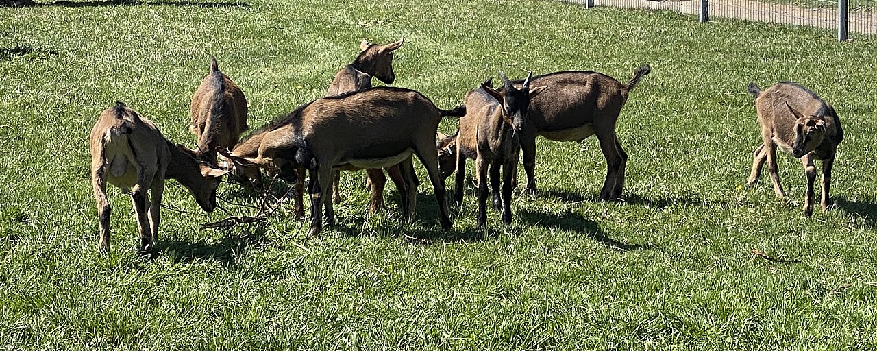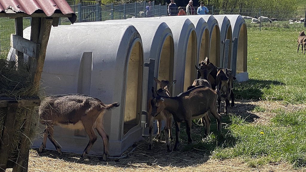 Einhundert Ziegen, davon 80 Muttertiere im Melkstand und 60 Schaflämmer trabten bei herrlichstem Sonnenschein auf die frische Wiese, um das Gras dort in Augenschein vor allem aber in den Magen zu nehmen. Ihrem ersten Freigang des Jahres schlossen sich die 900 Legehennen an, die inzwischen auf der Ziegenalm wohnen und Eier legen.