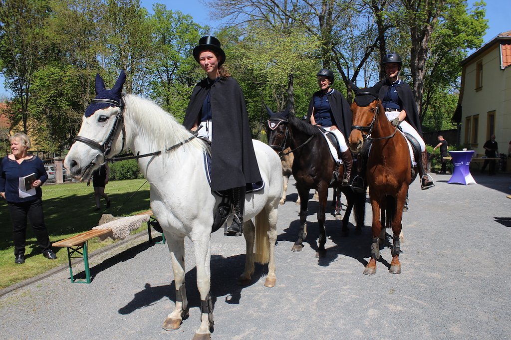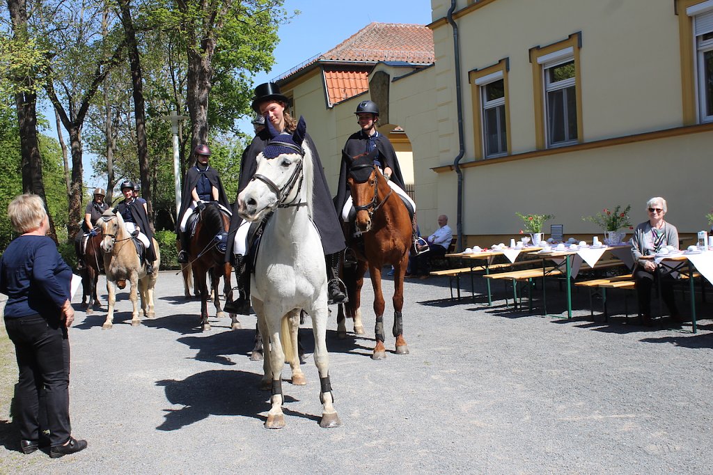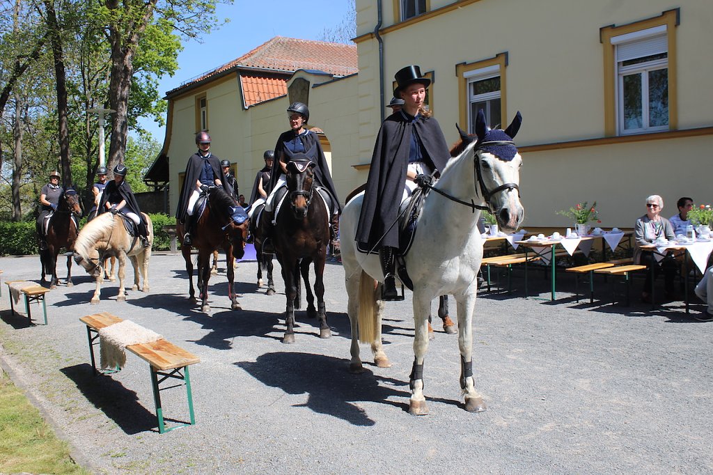 Novalisritt: Die Reiterinnen des "Gestüts Hainleite aus Niederbösa" erreichen das Seniorenzentrum Am Waidhof der Novalis Diakonie in Schloss Sophie von Kühn in Grüningen (Foto: Eva Maria Wiegand)