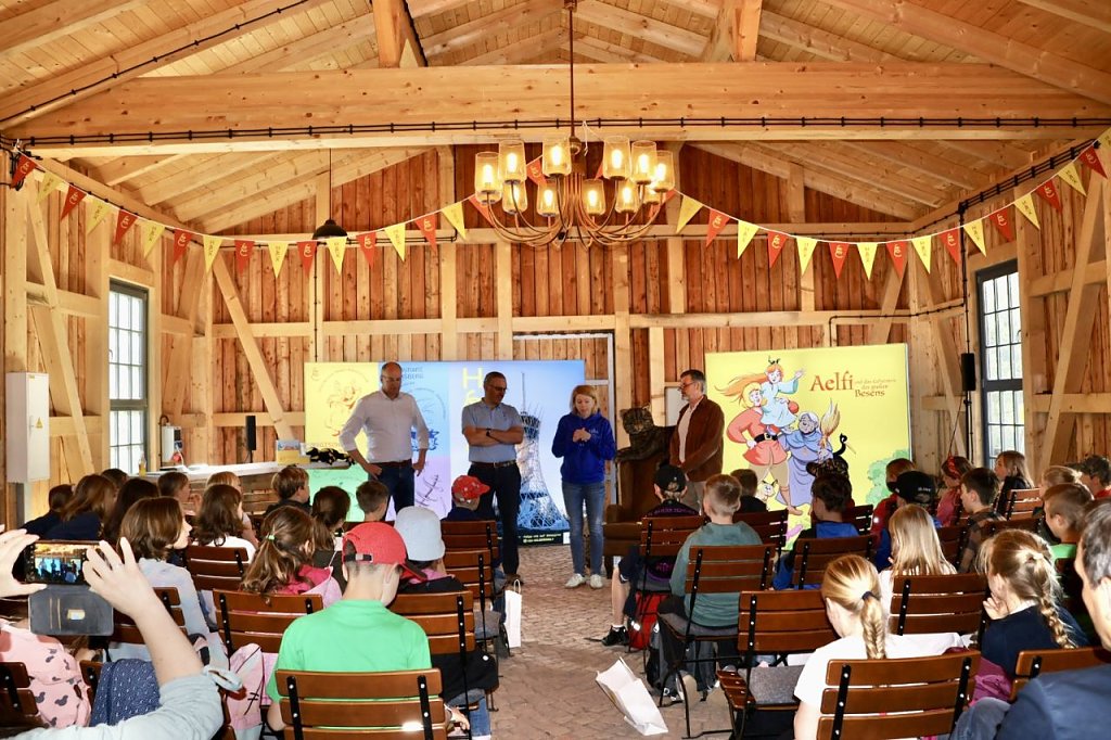 Das Team der HEX Erlebniswelt präsentierte das Kinderbuch gemeinsam mit dem Autoren Jens Schubert bei einer Premierenlesung in Rothesütte vor begeisterten Zweit- und Drittklässlern aus der Grundschule Ilfeld. Die Mädchen und Jungen ließen sich dann auch die Gelegenheit nicht entgehen, sich ihr Buch vom Autoren signieren zu lassen.
