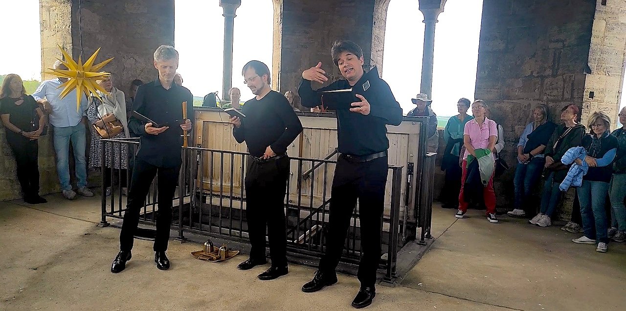 Bereits der Einseg überraschte: Man bat das Publikum ins obere Turmgeschoß. Nach Begrüßung und Einführung erklangen unter dem Titel Einzug des Frühlings Troubadur-Lieder und Hymnen in alter französischer Sprache und Latein. Die Fröhlichkeit und der beherzte Rhythmus in diesem Klangraum gleich unter dem Himmelszelt erfasste sogleich die Zuhörerinnen und Zuhörer mit der hier erstaunlich klangvollen Melodik im Glockengeschoß.