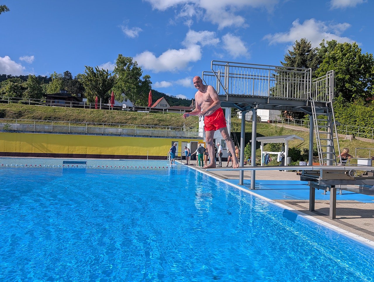 Die Badesaison im in Sondershausen ist ab heute eröffnet. Bürgermeister Steffen Grimm wagte den traditionellen ersten Sprung heute Morgen um 9 Uhr vor zahlreichen Stammgästen des Bades. Bei 16 Grad im Wasser und 13 Grad Lufttemperatur gehörte schon etwas Überwindung dazu...