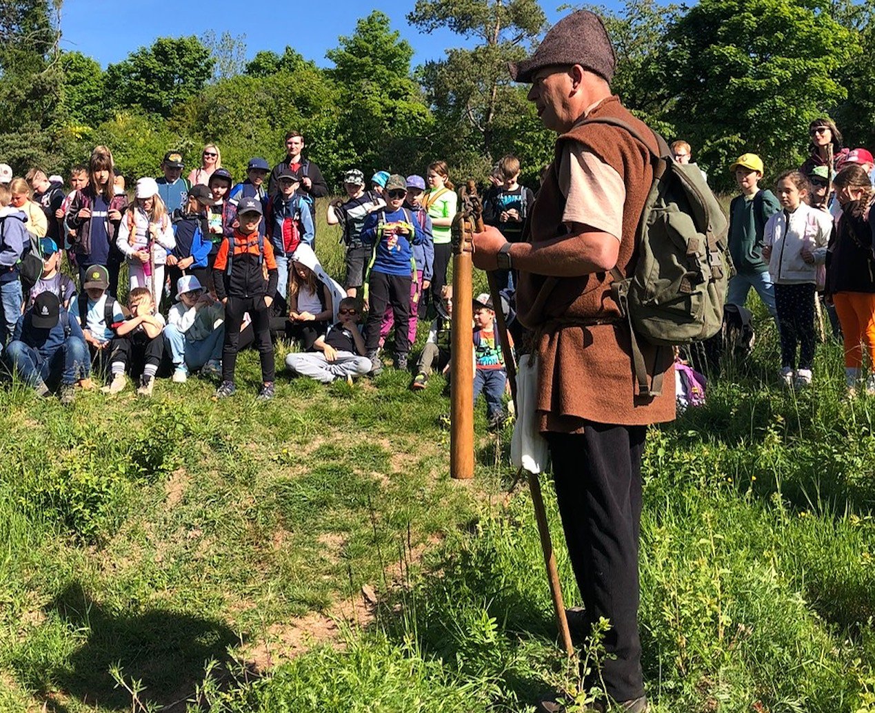 Mit herrlichstem Wanderwetter und guter Laune im Gepäck erkundete man zuerst den Wanderweg die Blutrinne, wo Sport- und Klassenlehrer Ingo Neumann als Bauer verkleidet den Kindern die Bedeutung des heutigen Namens erläuterte. Max stellte sofort fest, dass es mathematisch nicht sein kann, dass das Blut in Strömen bis in die Stadt floss bei der Anzahl der getöteten Menschen vor 500 Jahren im Bauernkrieg.